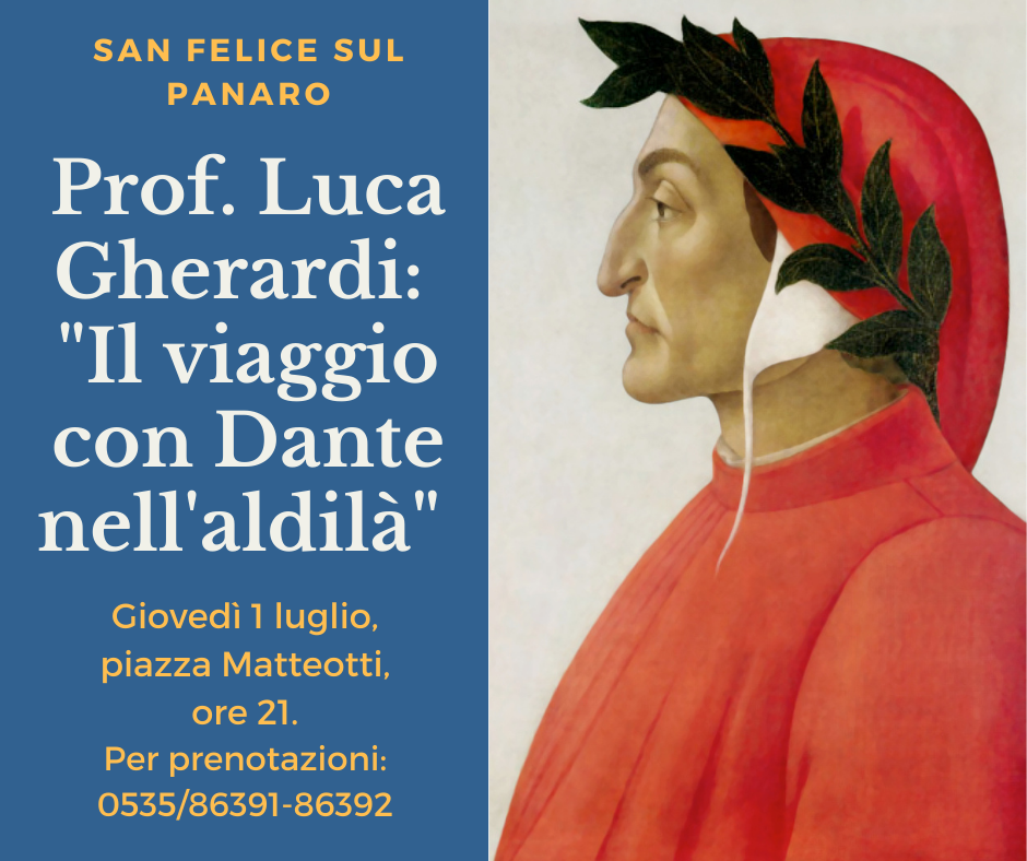 Giovedì 1° luglio a San Felice sul Panaro, in piazza Matteotti alle 21, il professor Luca Gherardi parlerà de: “Il viaggio con Dante nell’aldilà”.