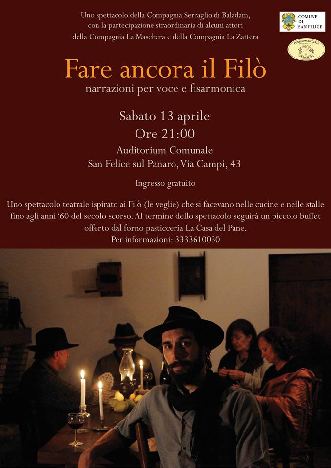 Sabato 13 aprile, alle ore 21, a San Felice sul Panaro, presso l’Auditorium Comunale di via Campi 43, va in scena lo spettacolo “Fare ancora il Filò”, della Compagnia Serraglio di Baladam, fondata dal regista e attore mirandolese Pierre Campagnoli. Per questa replica in particolare saranno presenti nello spettacolo diversi attori della Compagnia La Maschera e della Compagnia La Zattera.
