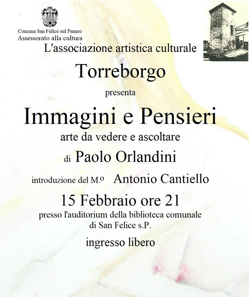 Sabato 15 febbraio a San Felice sul Panaro, presso l’auditorium della biblioteca comunale, ore 21, l’associazione artistica culturale Torreborgo presenta la conferenza di Paolo Orlandini: “Immagini e pensieri arte da vedere e ascoltare” con introduzione di Antonio Cantiello. L’iniziativa ha il patrocinio dell’assessorato alla Cultura del Comune di San Felice sul Panaro. Ingresso libero.