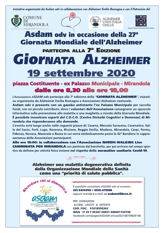 MIRANDOLA, SABATO 19 SETTEMBRE IN PIAZZA COSTITUENTE, EX PALAZZO MUNICIPALE, ASDAM ODV IN PARTECIPA ALLA 7ª EDIZIONE GIORNATA ALZHEIMER