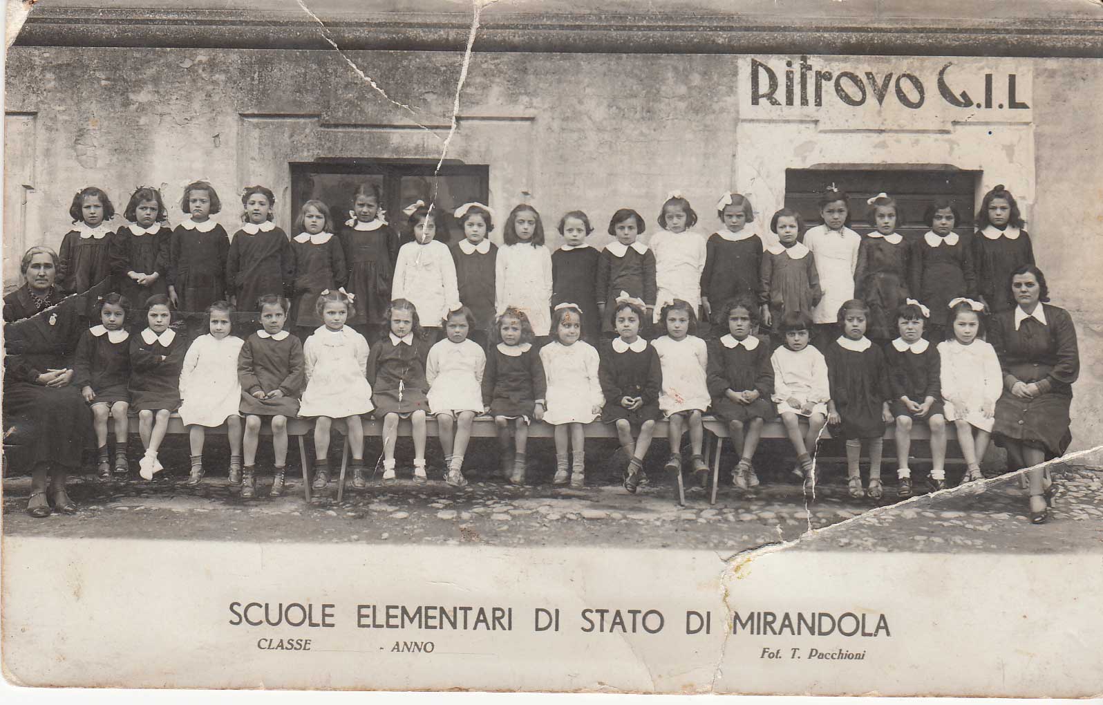 Nell’aula c’era la lavagna con i piedi, la cattedra con sotto la pedana che la rialzava, i banchi di legno “a due” con i seggiolini attaccati e con il calamaio. Sul muro c’era il crocefisso, la fotografia del re, la fotografia del duce e anche quella di donna Rachele, sua moglie. C’era anche una piantina di Mirandola con le sue frazioni tanto grande che arrivava fino al soffitto così la vedevano anche le bambine che stavano negli ultimi banchi e c’era il termosifone caldo.