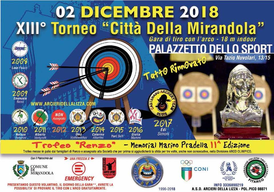 Si svolgerà domenica 2 dicembre al Palasport “Simoncelli” il 13esimo torneo “Città della Mirandola” di tiro con l’arco, gara di specialità 18 metri indoor (aperto a tutte le divisioni e classi).