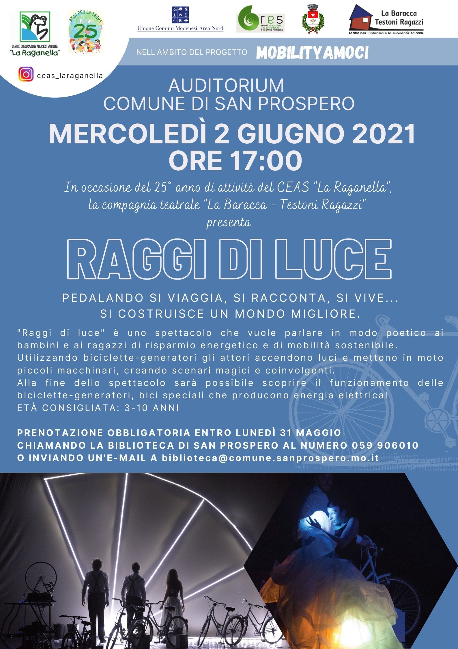 Il 2 giugno finalmente si torna a teatro e per uno spettacolo del tutto innovativo! In occasione del suo 25° anno di attività, il CEAS “La Raganella” propone, insieme al Comune di San Prospero, lo spettacolo Raggi di luce con lo scopo di parlare in modo poetico a bambini, ragazzi e adulti dell’importanza del risparmio energetico.