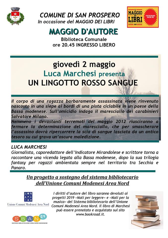 Giovedì 2 maggio a San Prospero, presso la biblioteca comunale, alle ore 20.45 primo appuntamento della rassegna “Maggio d’autore”. Lo scrittore e giornalista Luca Marchesi presenterà il suo nuovo romanzo: “Un lingotto rosso sangue”, un thriller ambientato nella Bassa modenese in cui omicidi, amori proibiti, misteri e magia s’intrecciano creando una trama mozzafiato. L’appuntamento di giovedì 2 maggio è organizzato dal Comune di San Prospero. Il volume verrà pubblicato al raggiungimento di un numero minimo di prenotazioni sulla piattaforma www.bookroad.it e i diritti d’autore del libro saranno destinati ai progetti 2019 “Nati per Leggere” e “Nati per la Musica” delle biblioteche del Sistema bibliotecario dell’Unione Comuni Modenesi Area Nord.