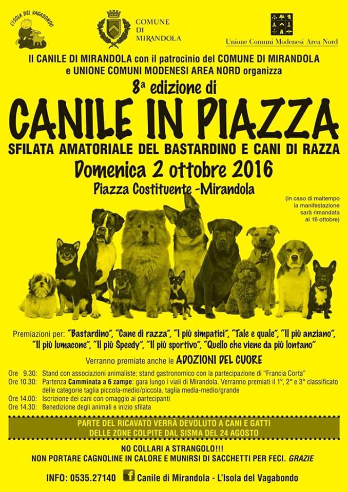 Parte del ricavato della manifestazione sarà devoluto a cani e gatti delle zone colpite dal sisma dell’Italia Centrale. In caso di maltempo, l’iniziativa sarà rinviata a domenica 16 ottobre. Organizza il Canile di Mirandola con il patrocinio di Comune e Unione Comuni Modenesi Area Nord.