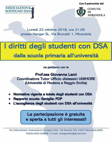 Si terrà lunedì 22 ottobre a Mirandola, presso l’Hangar di via Brunatti 1 (ore 21), una conferenza su “I diritti degli studenti con Dsa (Disturbi Specifici dell’Apprendimento), dalla scuola primaria all’Università”.