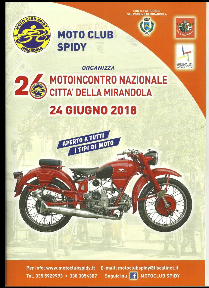 Domenica 24 giugno, dalle ore 8.30, è in programma il 26esimo motoincontro nazionale Città della Mirandola, organizzato dal Motoclub Spidy in collaborazione con il Comune di Mirandola, la Consulta del volontariato e la Federazione Motociclistica Italiana.