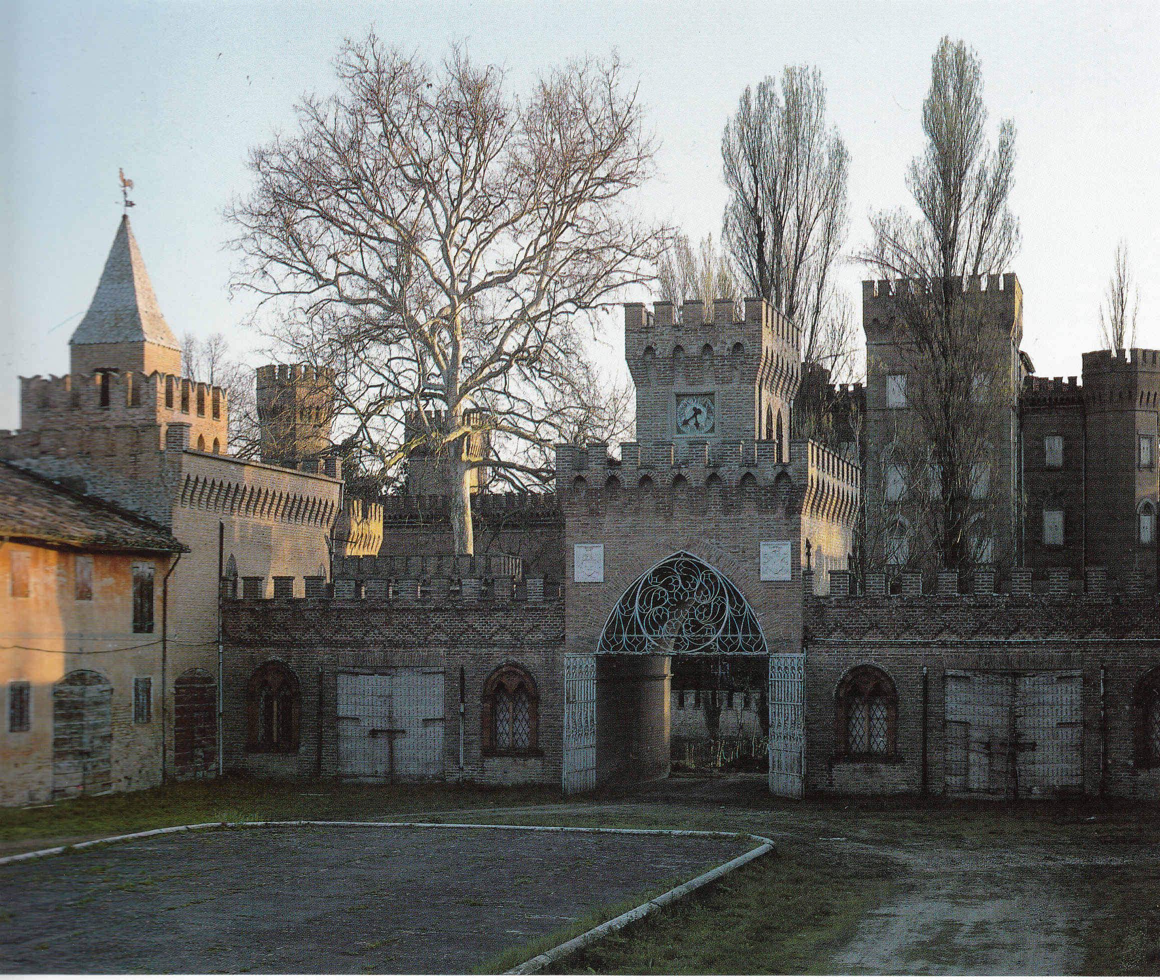 porte merlate di accesso. Nella seconda fase (1911-1914) l’aggiunta delle ali laterali, di una più ampia recinzione e dell’intero parco trasformò la fisionomia rigida e bloccata del primitivo maniero in un ambiente di grande valenza scenografica.