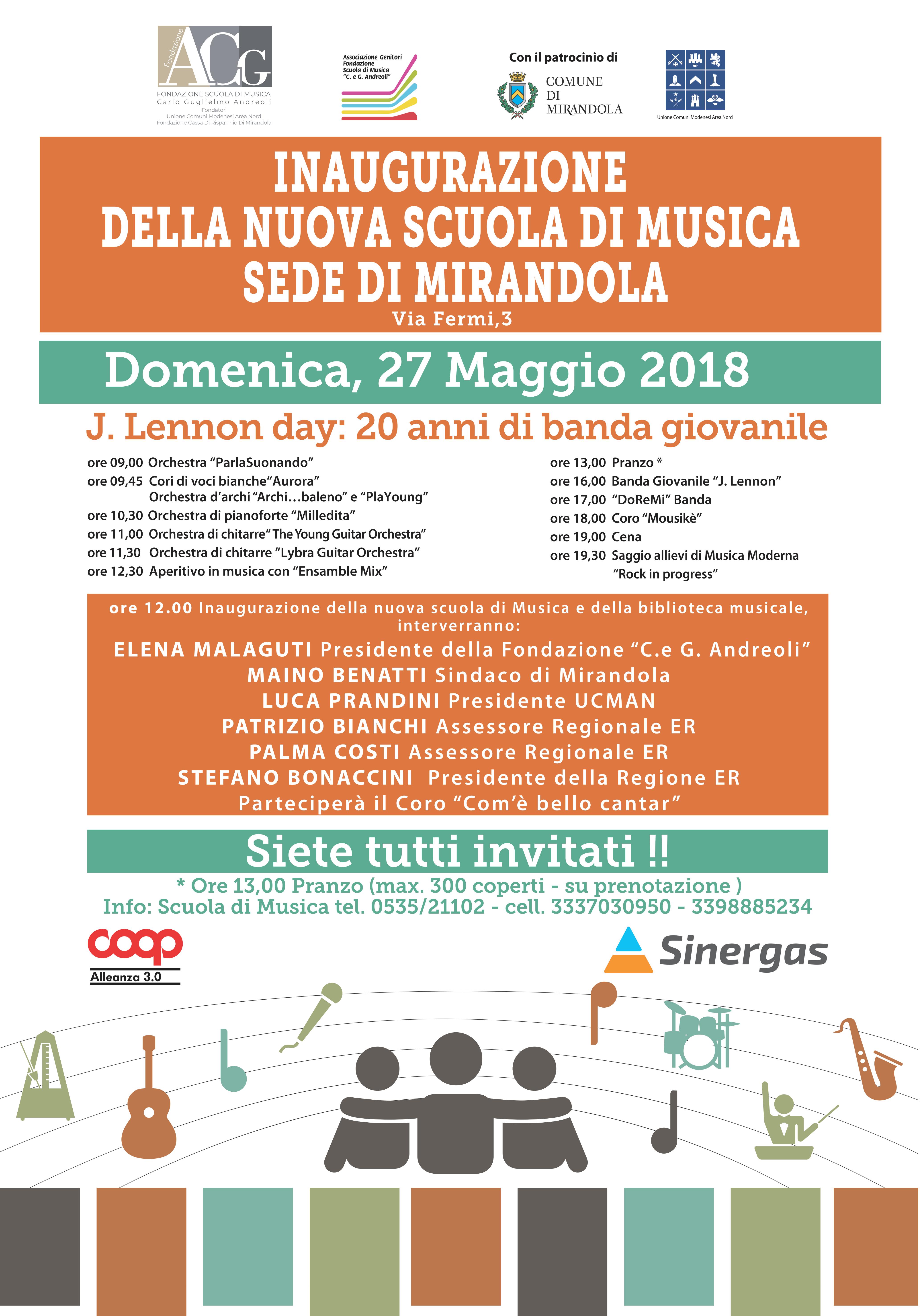 Domenica 27 maggio, in via Fermi 3 a Mirandola (MO), sarà inaugurata la nuova sede mirandolese della scuola di musica della Fondazione “Carlo e Guglielmo Andreoli”.