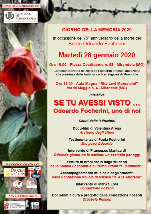 In occasione della Giornata della Memoria, martedì 28 gennaio 2020, l’Amministrazione comunale mirandolese in collaborazione con il Gruppo di lavoro della Diocesi di Carpi per il Beato Focherini, ha predisposto un programma di iniziative che coinvolgerà la cittadinanza e gli studenti delle scuole medie e superiori accompagnati dai loro insegnanti. Alle ore 10.00 in piazza Costituente 58, davanti all’abitazione del Beato Focherini dove lo scorso anno è stata collocata la ‘pietra d’inciampo’, si terrà la commemorazione ufficiale alla presenza delle Autorità civili e religiose. A seguire a partire dalle ore 11.00 presso l’Auditorium “Rita Levi Montalcini” gli studenti parteciperanno ad un incontro sul tema “Se tu avessi visto…Odoardo Focherini uno di noi” con testimonianze dei familiari, letture delle lettere dal campo di concentramento, brani musicali e filmati. Oltre all’Amministrazione Comunale di Mirandola e alla Diocesi di Carpi, collaboreranno all’iniziativa la scuola di Musica “C. e G. Andreoli”, la scuola secondaria di primo grado “F. Montanari”, con il patrocinio della Fondazione Fossoli e della Fondazione Cassa di Risparmio di Mirandola.