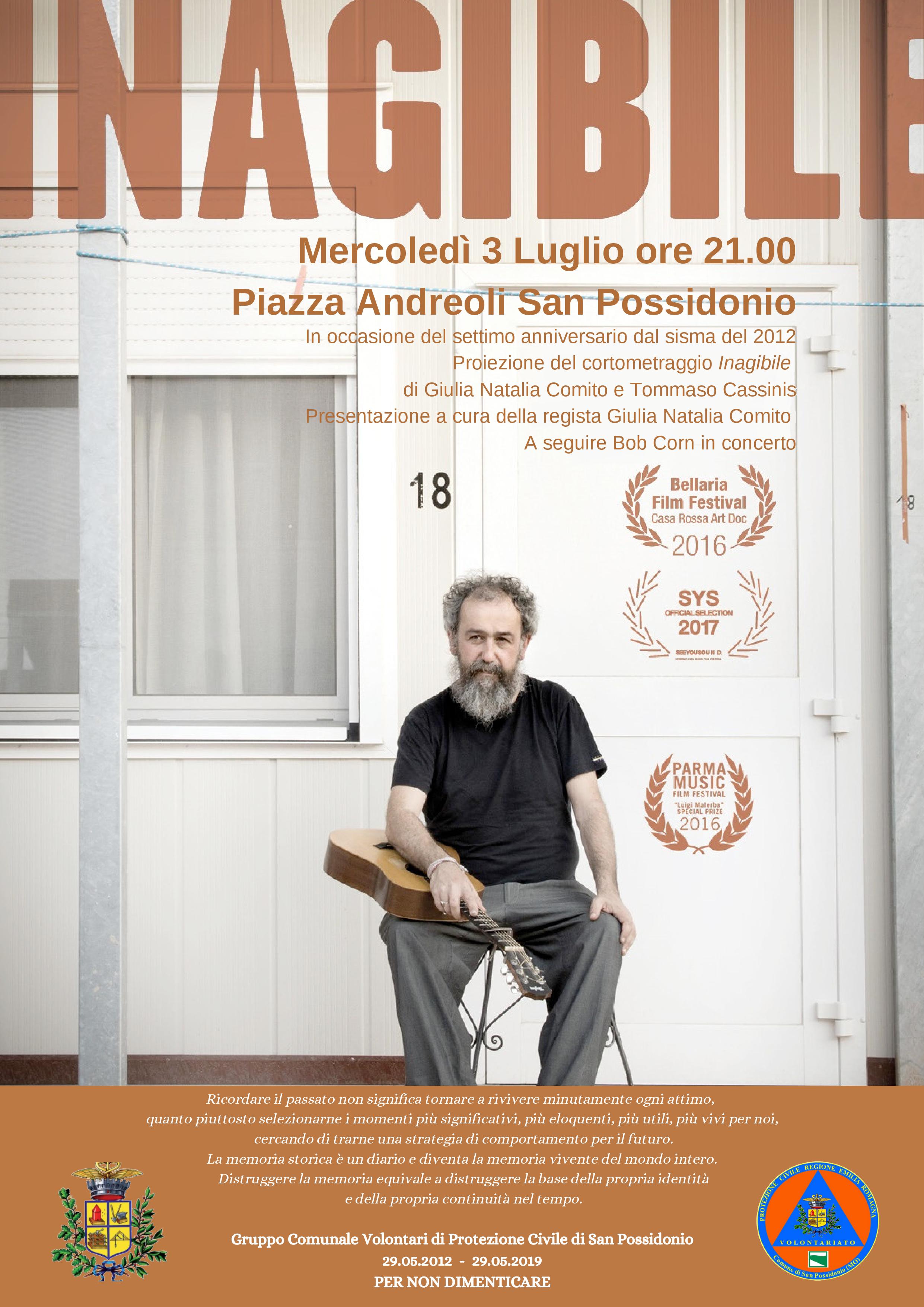 Mercoledì 3 Luglio 2019 verrà recuperata la serata promossa dal Gruppo Volontari della Protezione Civile di San Possidonio, in occasione del settimo anniversario dal sisma del 2012. Verrà proiettato il cortometraggio Inagibile (Italia 2016 durata 27′) di Cassinis e Comito, presentato dalla regista Giulia Natalia Comito. A seguire Bob Corn in concerto.