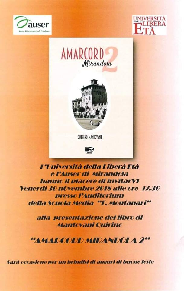Sarà presentato venerdì 30 novembre a Mirandola, alle ore 17.30, presso l’auditorium delle scuole medie “Montanari” (via Nuvolari), il volume promosso dall’Auser intitolato “Amarcord Mirandola 2”.