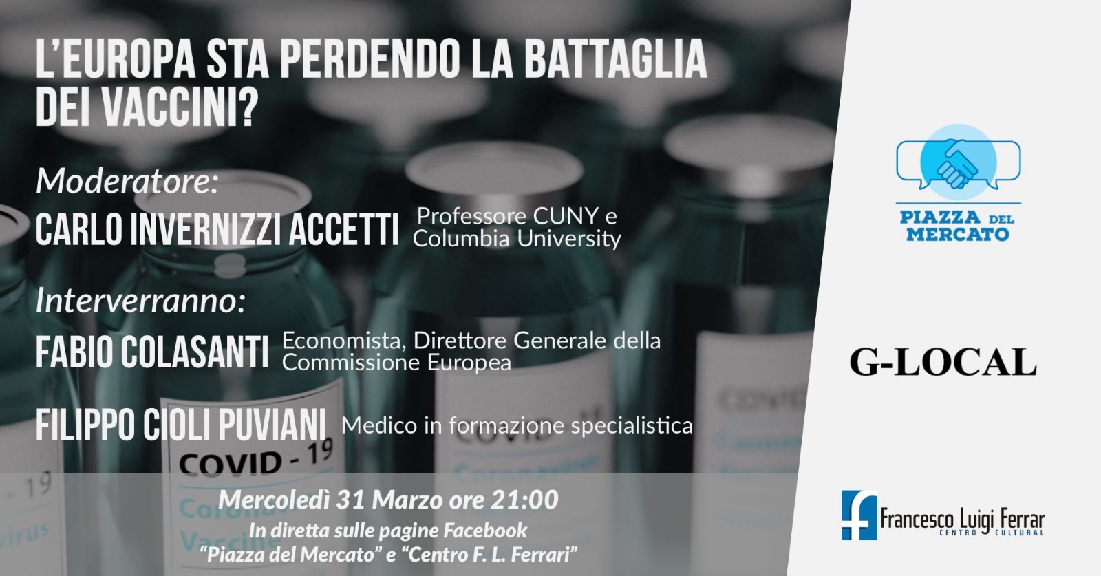 Se ne parlerà nell’incontro che avrà luogo mercoledì 31 marzo alle ore 21.00 intitolato “L’Europa sta perdendo la battaglia dei vaccini?”, in diretta sulle pagine Facebook di Piazza del Mercato e Centro Culturale Francesco Luigi Ferrari, in cui interverranno l’economista ed ex Direttore Generale della Commissione Europea Fabio Colasanti e Filippo Cioli Puviani, medico sanfeliciano in formazione specialistica. L’incontro sarà coordinato da Carlo Invernizzi Accetti, professore presso CUNY e Columbia University.
