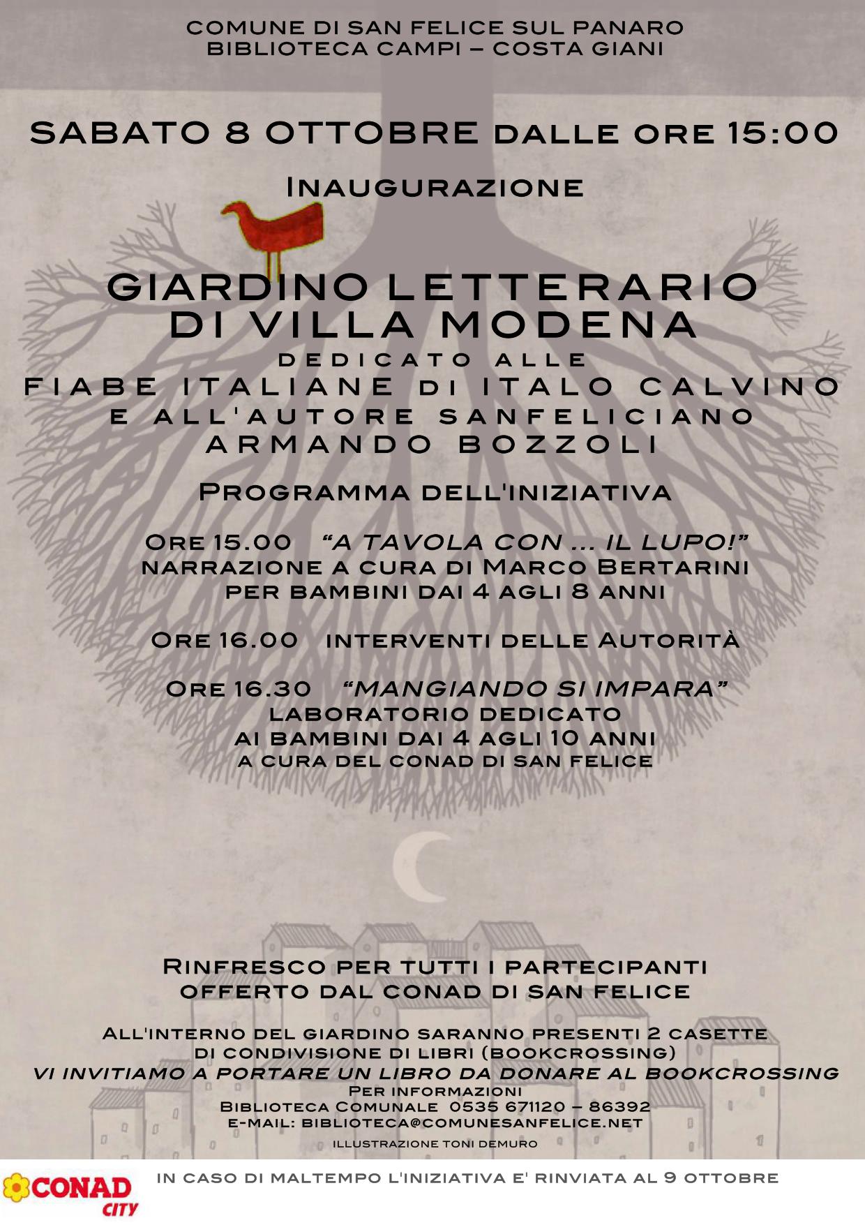 Sabato 8 ottobre a partire dalle ore 15, nell’area adiacente al Conad, in Via San Bernardino, avrà luogo l’inaugurazione del giardino letterario di Villa Modena, dedicato alle “Fiabe italiane” di Italo Calvino e all’autore sanfeliciano Armando Bozzoli (1924-1987).