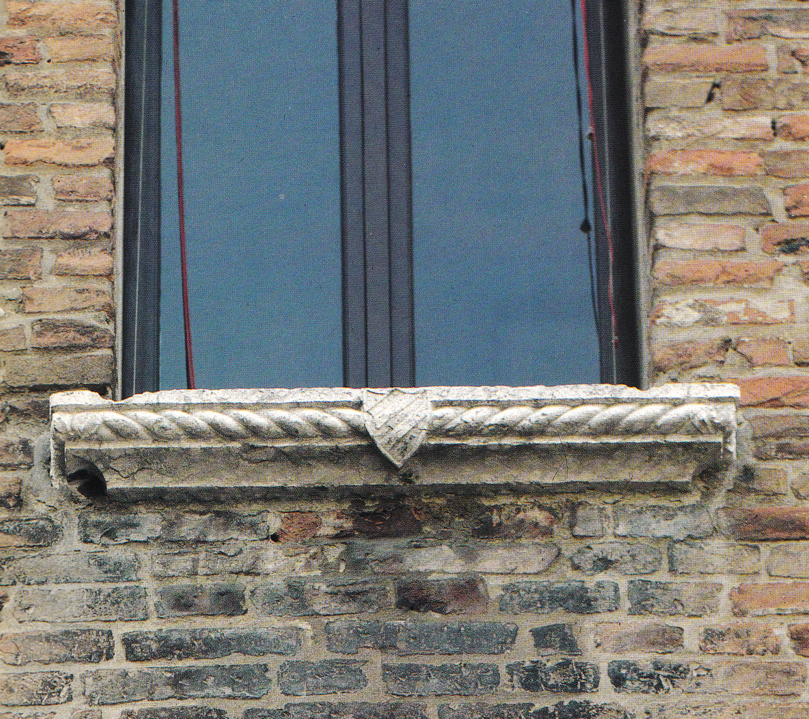Tra i pochi edifici di origine antica sopravvissuti a Mirandola, il «Palazzo della Ragione» spicca per elementi strutturali e decorativi di pregio: le tracce del porticato in facciata ad archi a sesto acuto, il balconcino angolare su mensoloni marmorei, i bancali di marmo alle finestre del primo piano, ora però divenute rettangolari per un rifacimento settecentesco. Nei bancali, la cornice sporgente, scolpita con elementi a treccia di gusto gotico, si apre al centro in scudetti lanceolati che recano stemmi a fasce trasversali, semplificata versione dell’arma dei Pico. L’ipotesi della funzione pubblica del palazzotto, in allineamento con la casa della comunità, viene avvalorata anche dall’araldica della famiglia signorile, protagonista dell’organizzazione civile e amministrativa della città.