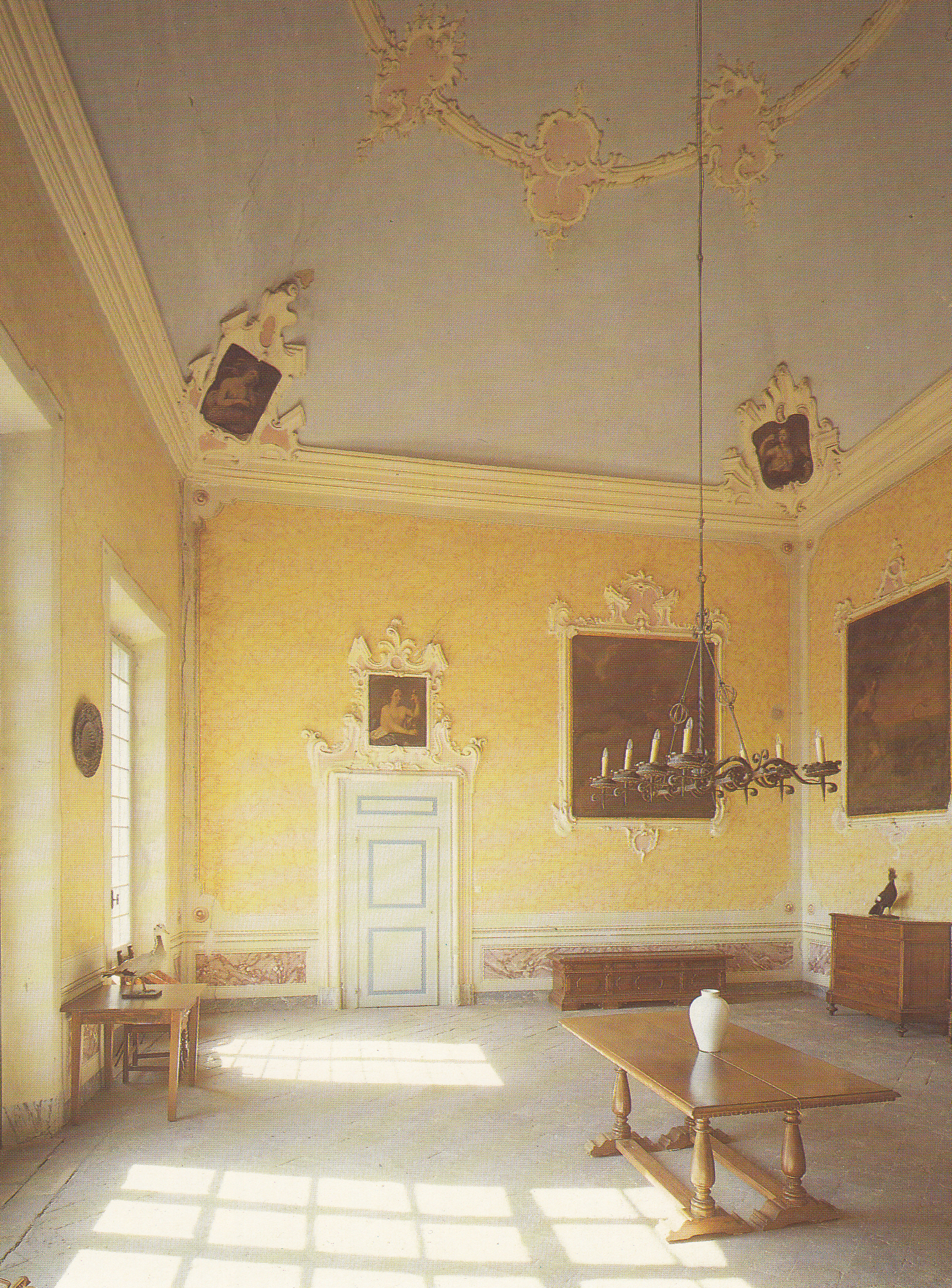 Così nei pennacchi con tele raffiguranti Le quattro Arti agli angoli della volta a padiglione dell’atrio al piano terreno, o nel sinuoso sopracamino con specchiera ornata da tralci di fiori e foglie in una saletta attigua. E più ancora nel salone d’onore: vaste cornici rettangolari con soggetti mitologici alle pareti, due sovraporta con le immagini di Diana (con freccia e con levriero), quattro pennacchi con Le Stagioni, e al sommo della volta a padiglione un rosone con due cerchi intersecantisi.