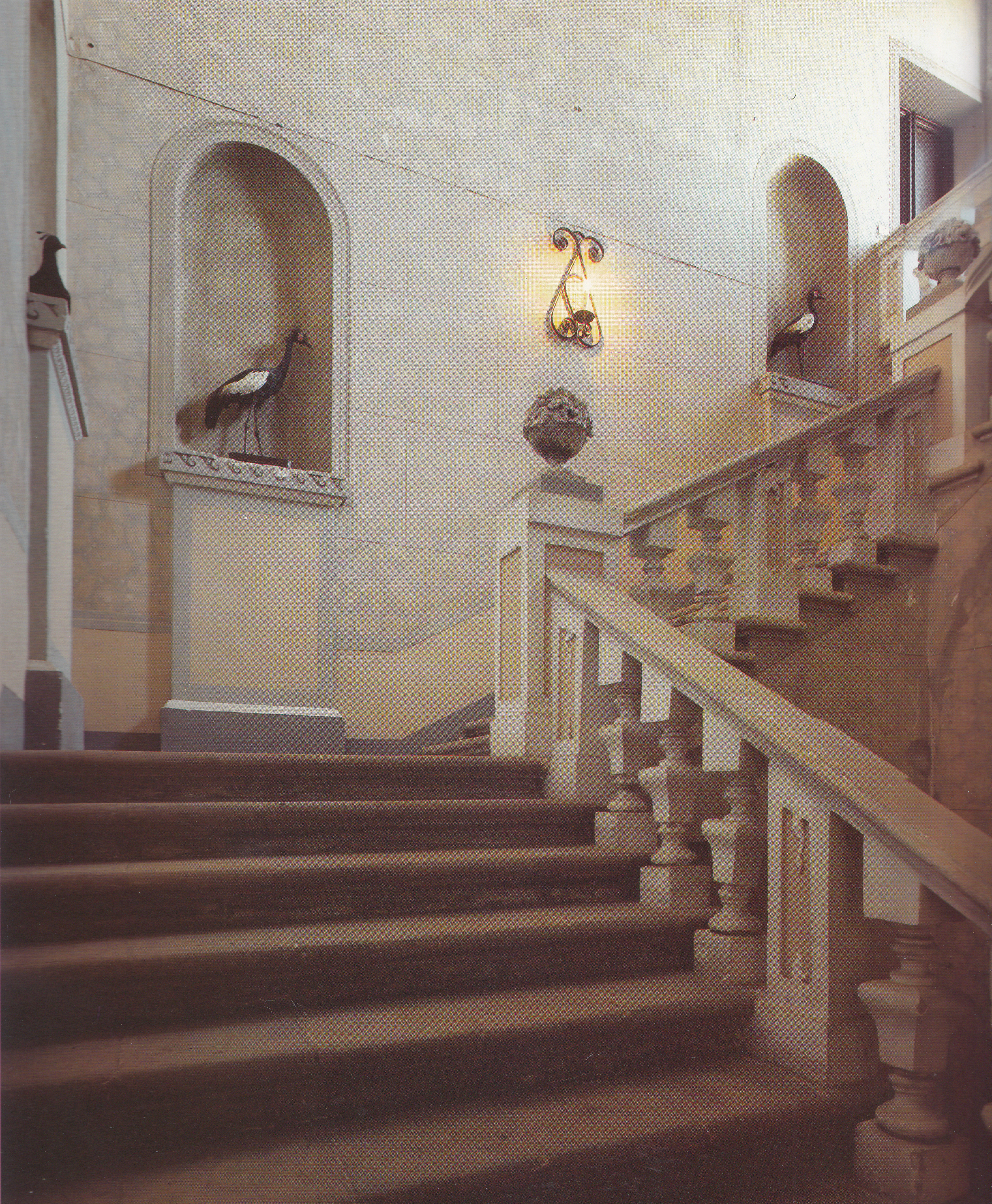 All’interno del palazzo l’organizzazione degli spazi, oggi solo parzialmente alterata da necessità d’uso, si articolava in ampie sale di rappresentanza, affacciate sul fronte, dove trovava posto anche una ricca e preziosa raccolta di volumi. Altre sale di ricevimento si trovano al piano nobile cui s’accede da uno scalone a tre rampe originariamente scandito da un incedere di statue, sistemate nelle nicchie e sui pilastri della balaustra, ora incongruamente sostituite da volatili impagliati e da fiorì in cemento.