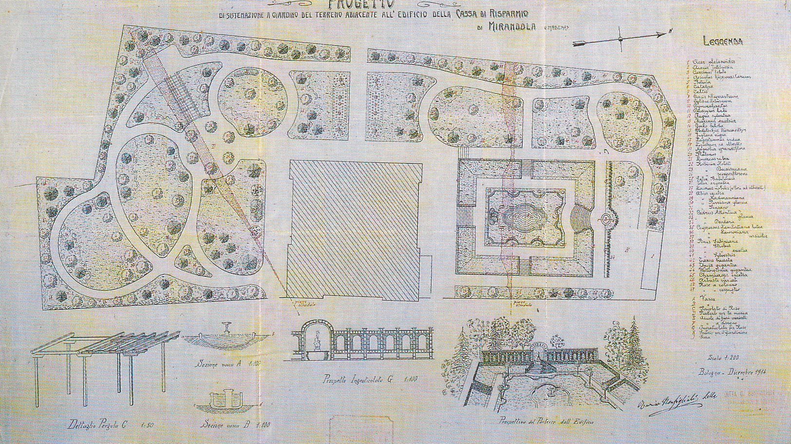 Il disegno si riferisce al progetto redatto nel 1914 da Enrico Bonfiglioli della Ditta Bonfiglioli e F. per la realizzazione di un giardino nel terreno attorno al Palazzo della Cassa di Risparmio di Mirandola. Secondo gli schemi consueti il giardino era distribuito in due zone distinte: il parterre con giardino all’italiana e colonnato scenografico da un lato del palazzo, il parco all’inglese con alberi, arbusti e aiuole fiorite dall’altro lato.