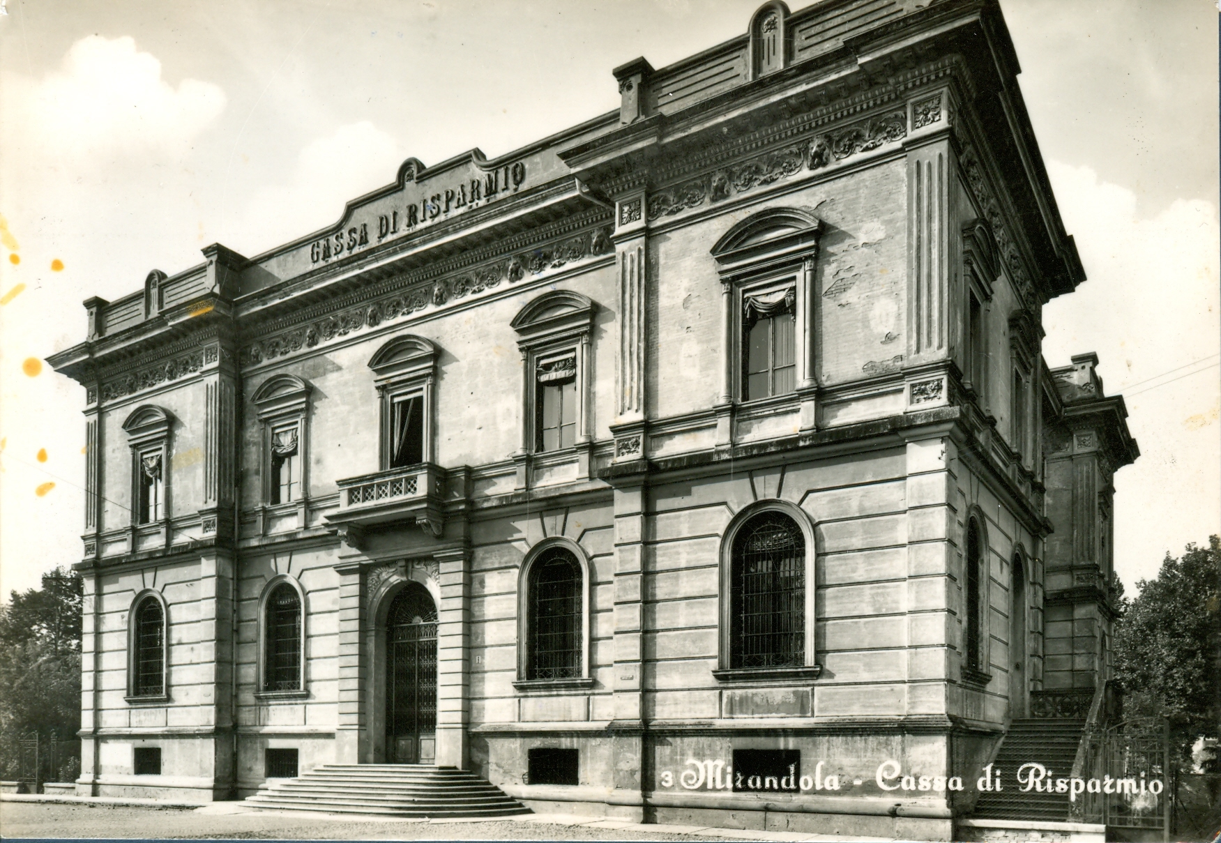 Come risulta dal volume edito dalla Cassa di Risparmio di Mirandola in occasione del centenario della sua fondazione l’istituto di credito ebbe la sua prima sede presso il palazzo municipale: ospite del Comune (che ne fu uno dei principali promotori) dal 1864 al 1898, quando il Consiglio di Amministrazione decise l’acquisto del palazzo Bergomi per acquisire maggiore spazio.