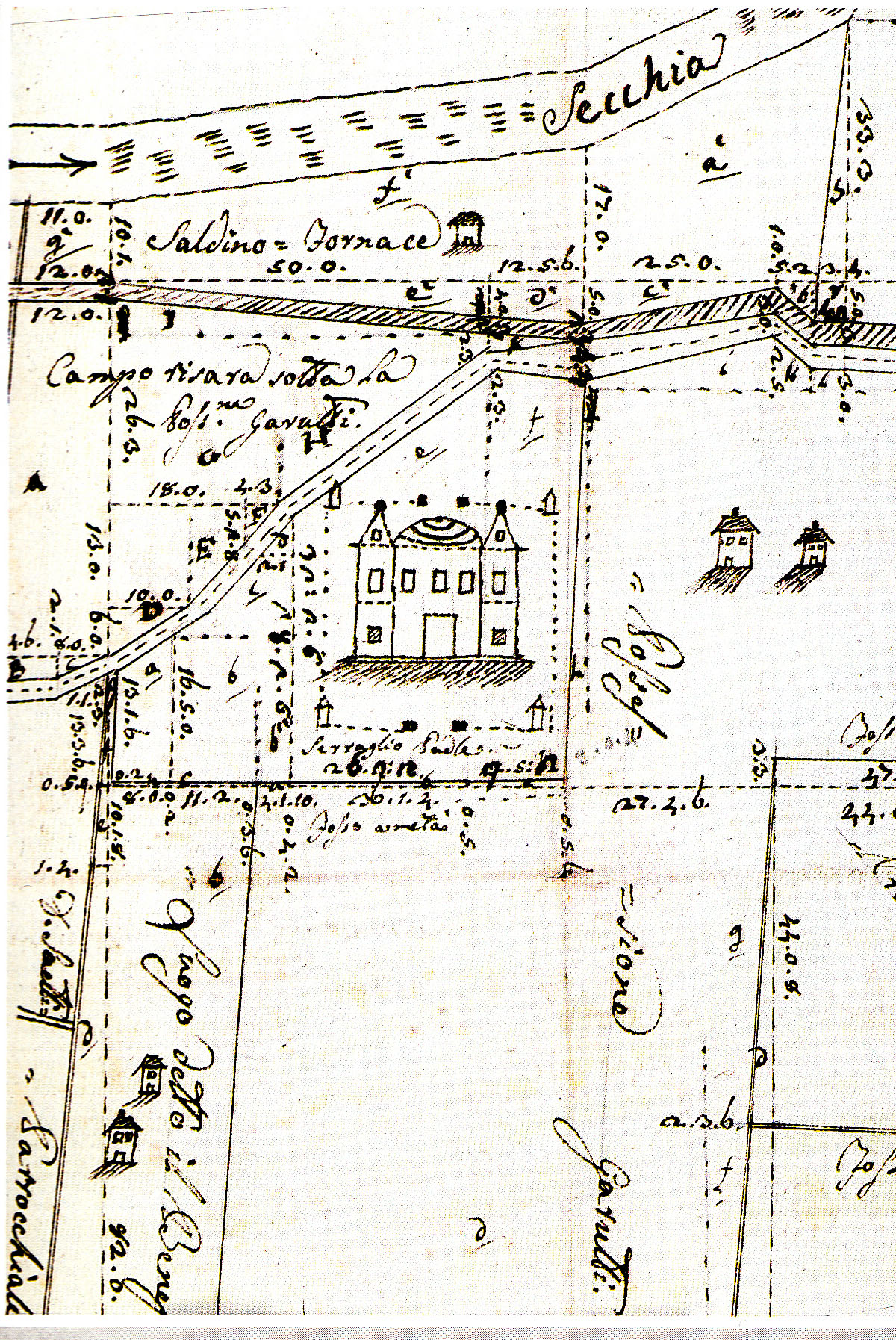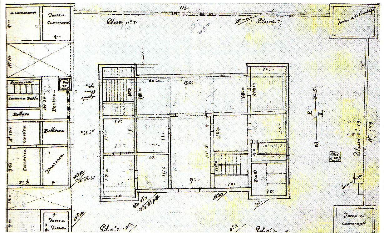 Particolare della mappa dell'ingegnere Giuseppe Maria Toschi, datata 1810 e raffigurante il prospetto originale della villa.