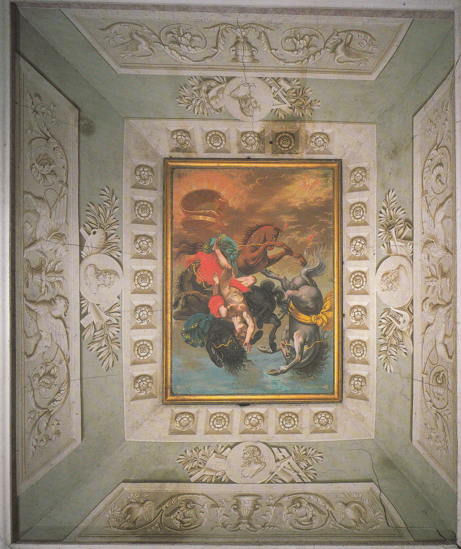 L’unica decorazione rimasta a seguito dei recenti interventi, riguarda la volta a padiglione dello scalone, ornata da un plafond di gusto tardo seicentesco raffigurante La caduta di Fetonte, che appare ridipinto forse in epoca ottocentesca. A tali date vanno infatti riferite le fasce decorative e le specchiature a monocromo che, secondo repertori consueti in tutto il modenese — ippogrifi affrontati, racemi stilizzati, finti medaglioni con le immagini delle Arti, teorie di putti — incorniciano l’immagine fingendo stucchi e rilievi architettonici. Tali tipologie, diffuse soprattutto dall’entourage dei modenesi Luigi e Ferdinando Manzini e successivamente dal carpigiano Andrea Becchi, appaiono più volte replicate anche in territorio finalese, come risulta del resto consueta la bicromia uerdmo-grisaille. La si confronti ad esempio con quella della «Sala ovale» del Casino del Duca di San Felice sul Panaro.