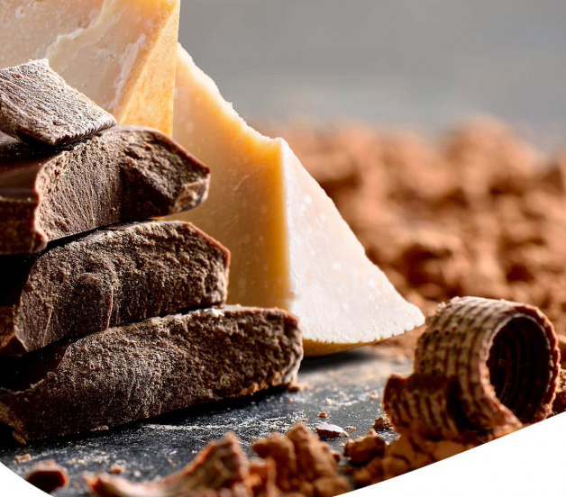 Cioccolato di Parmigiano Reggiano, salsa di pere e noci pralinate.