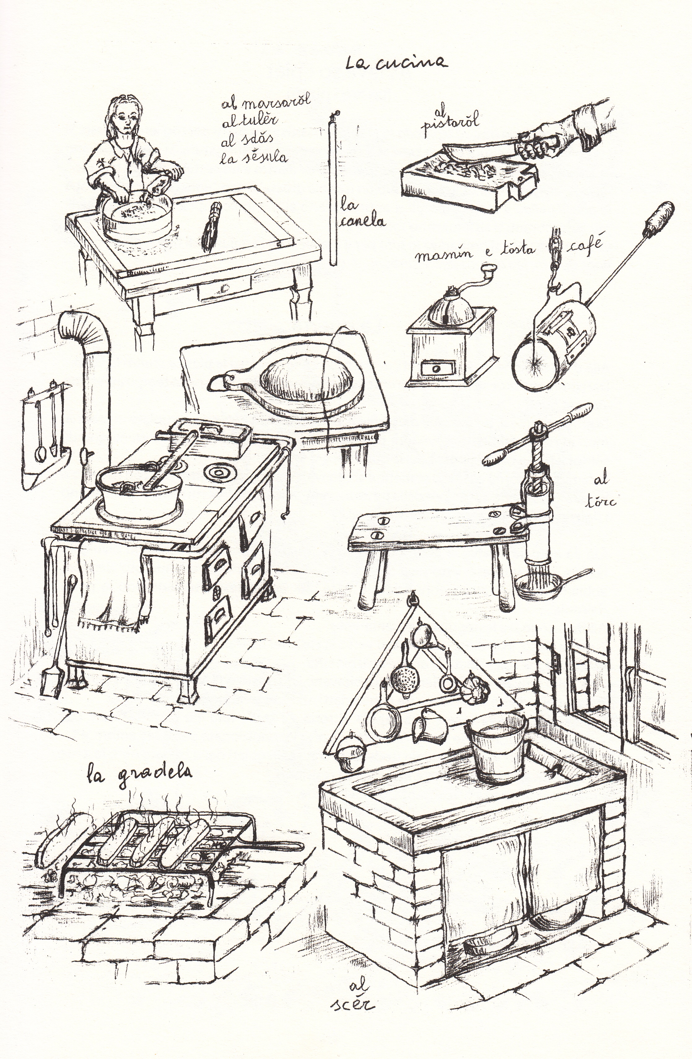 A volte c’era da scaricare un carro di fieno e allora as taiava un salàm e as vudava na butiglia at vin bianch. Si mangiavano anche i pinsìn, cun li pónti o rutond ad mè la padèla, oppure la pulenta, rustida in sla piastra ad la stua o in sla gradèla su li brasi dal fugulèr, messa a pezzi nella scodella piena di latte freddo con una panna spessa, oppure pulenta rustida con gras pista e aio con una noce di burro: ma la pulenta frita l’era quél da special. A mezzogiorno a gh’éra la mnèstra in brò: sifulòt, gramégna, past at puglia e quand l’andava mal, i gratin (acqua e farina impastada magari cun n’òf: si tagliavano tanti pezzetti piccoli come coriandoli).