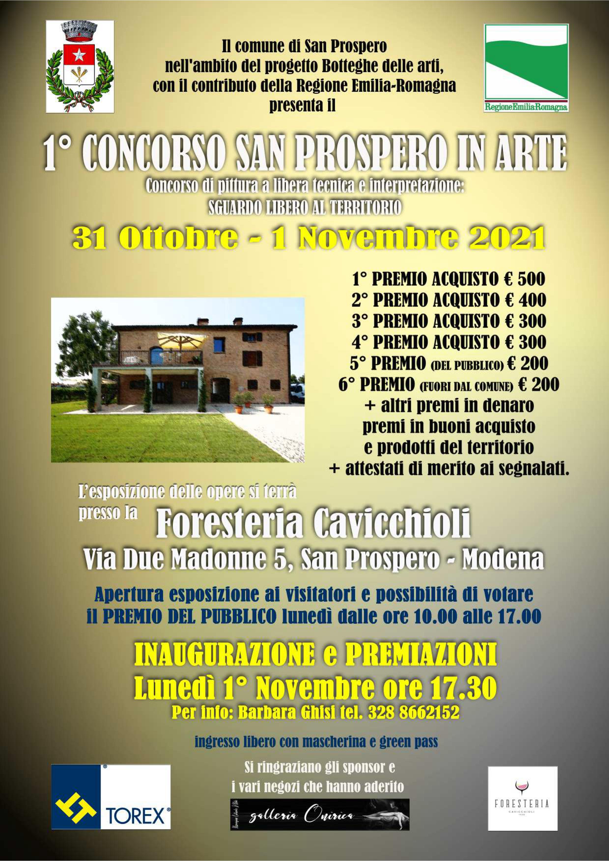 Le circa 70 opere in mostra resteranno esposte al pubblico lunedì 1 novembre dalle ore 10.00 alle 17.00 e i visitatori potranno votare l’opera preferita aiutando uno dei partecipanti a vincere il Premio del Pubblico. Ci sarà anche un Premio fuori dal Comune per premiare gli artisti che vengono da lontano. Una giuria qualificata provvederà all’assegnazione degli altri riconoscimenti messi a disposizione dagli sponsor Azienda Torex e Foresteria Cavicchioli, oltre ad altri premi in buoni acquisto, prodotti del territorio, targhe e attestati di merito. La cerimonia di premiazione avverrà lunedì 1 novembre dalle ore 17.30 alla presenza del Sindaco di San Prospero Sauro Borghi e delle autorità locali e regionali, il tutto in collaborazione con l’Associazione Culturale d’Arte Galleria Onirica.
