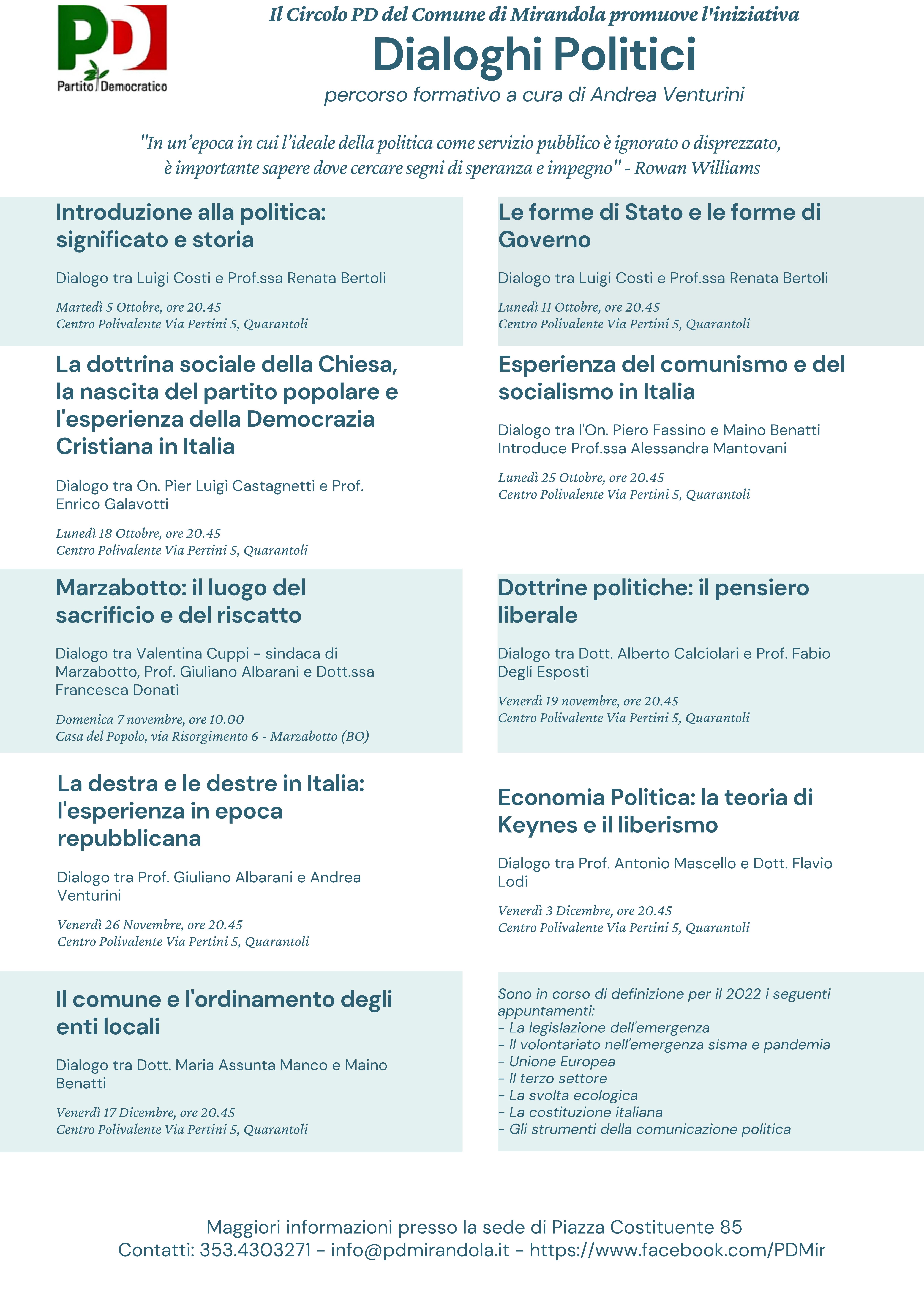 Andrea Venturini definisce “DIALOGHI POLITICI” un percorso formativo fondato su incontri a più voci nei quali gli argomenti vengono analizzati con lo strumento del confronto tra opinioni ed esperienze diverse.