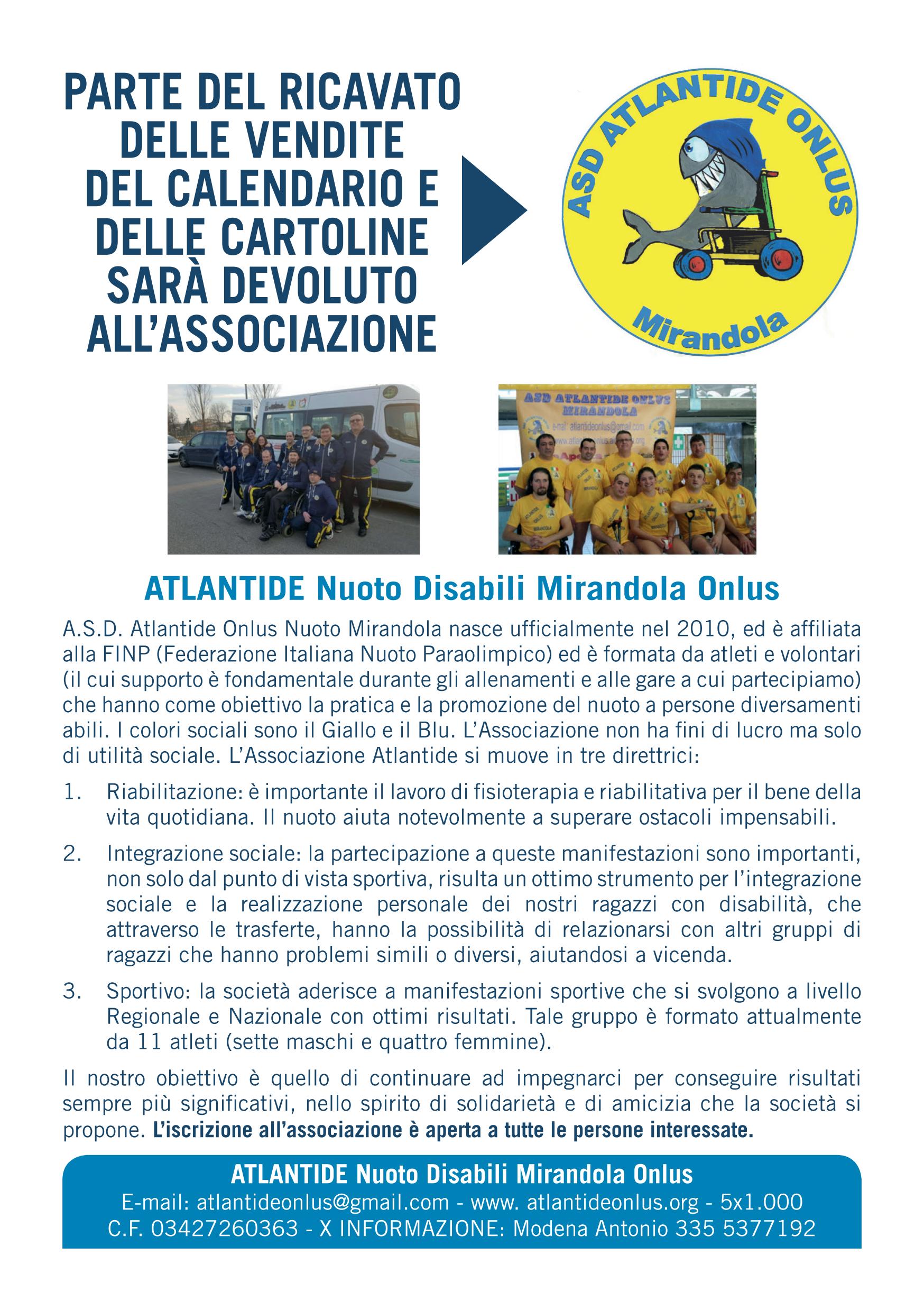 Il ricavato, tolte le spese vive, andrà all’Associazione Mirandolese “ASD Atlantide Onlus”, affiliata alla FINP (Federazione Italiana Nuoto Paraolimpico). Il costo è di 10,00 euro per il calendario e 10,00 euro per le cartoline. Si ringrazia Dino Cassanelli per il materiale messo a disposizione e Monica Caleffi per le bellissime poesie a corredo del calendario.
