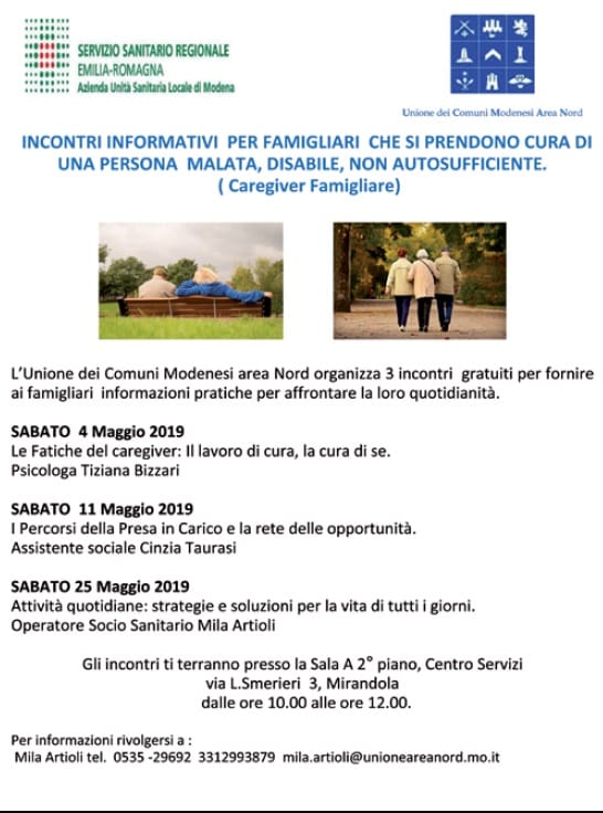 L’Unione Comuni Modenesi Area Nord organizza tre incontri gratuiti per fornire informazioni pratiche alle persone che si prendono cura di parenti malati, disabili o non autosufficienti. Sabato 4 maggio Tiziana Bizzarri parlerà delle fatiche del caregiver. Sabato 11 maggio Cinzia Taurasi tratterà dei percorsi della presa in carico e della rete delle opportunità. Sabato 25 maggio Mila Artioli fornirà qualche consiglio sulle strategie e soluzioni per la vita di tutti i giorni. Gl’incontri si terranno dalle ore 10.00 alle 12.00 nella Sala A del Centro Servizi situato in via Smerieri 3, a Mirandola. Organizzano Ausl Modena e Unione Comuni Modenesi Area Nord. Per informazioni contattare Mila Artioli (0535/29692; mila.artioli@unioneareanord.mo.it).