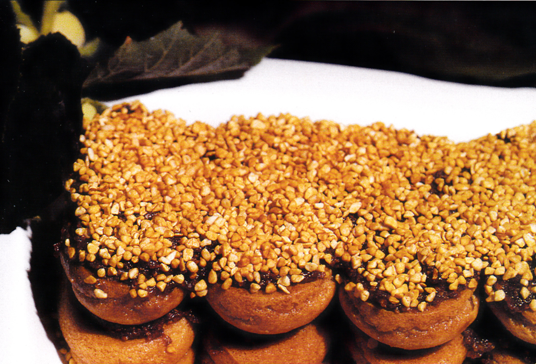 Tritate finemente le nocciole con lo zucchero, mettetele in una terrina, aggiungete il cacao, il burro morbido, i tuorli passati al setaccio e un savoiardo sbriciolato e imbevuto di Brandy. Amalgamate bene questi ingredienti, in modo da ottenere una crema. Su di un piatto, disponete uno strato a forma di quadrato di savoiardi imbevuti di Marsala, cospargeteli di crema e proseguite a strati finendo con la crema. Coprite il tutto con mandorle tritate e mettete in frigorifero alcune ore prima di servire.