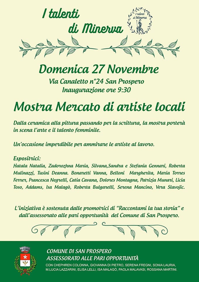 Dalla ceramica alla scrittura, dall’arte della pasticceria alla pittura, il Comune di San Prospero e un gruppo di volontarie celebrano l’arte e l’ingegno femminile. La mostra s’intitola “I talenti di Minerva”, omaggiando la dea romana protettrice di artigiani e artigiane. La mostra si aprirà con un piccolo rinfresco e i saluti del Sindaco di San Prospero Sauro Borghi e dell’assessora a Educazione e Saperi dell’Unione Comuni Modenesi Area Nord Monja Zaniboni. Per tutta la giornata sarà possibile ammirare le artiste al lavoro e acquistare le loro creazioni.