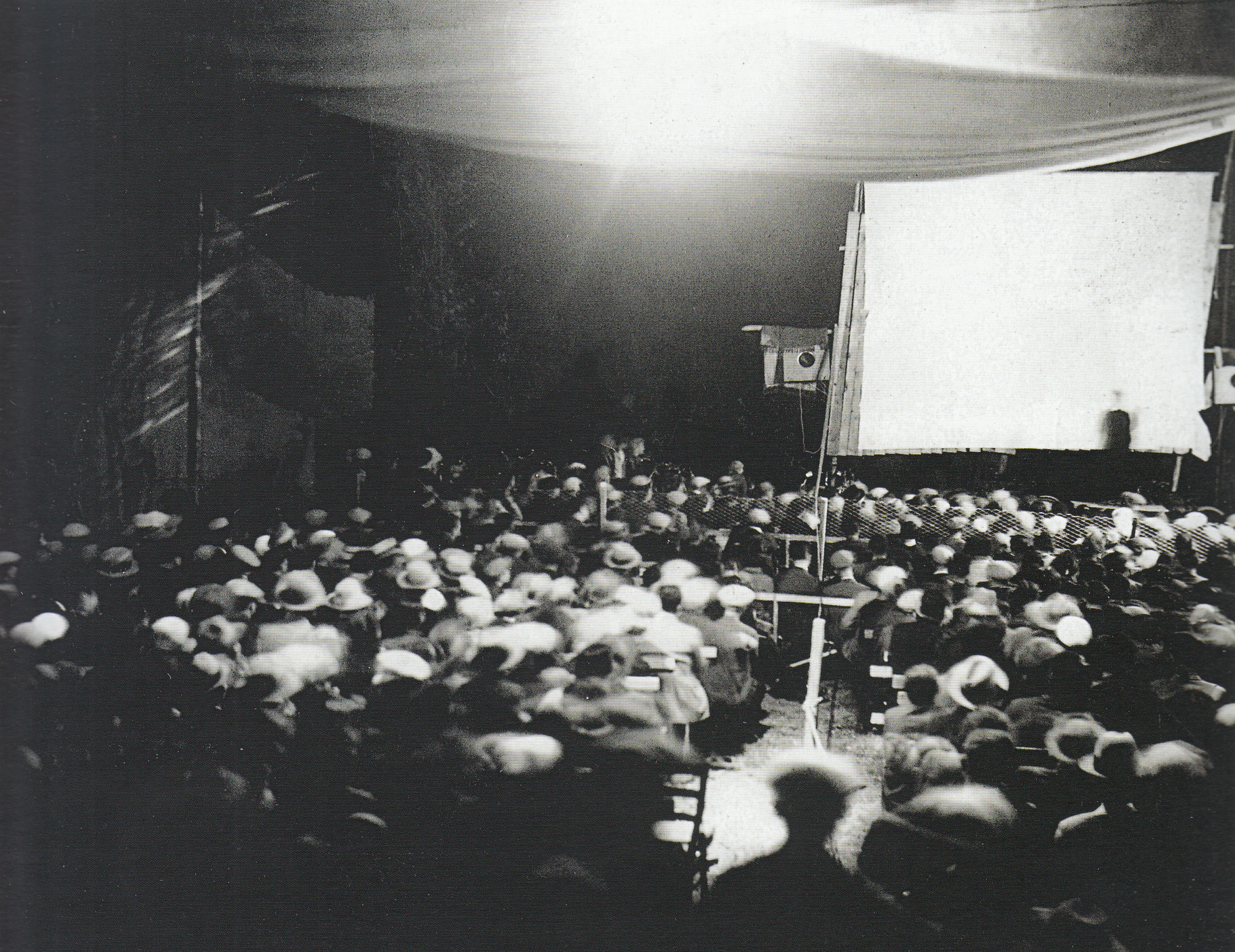 San Giacomo Roncole - Una delle prime immagini della proiezione del cinema all'aperto, dietro al casinone