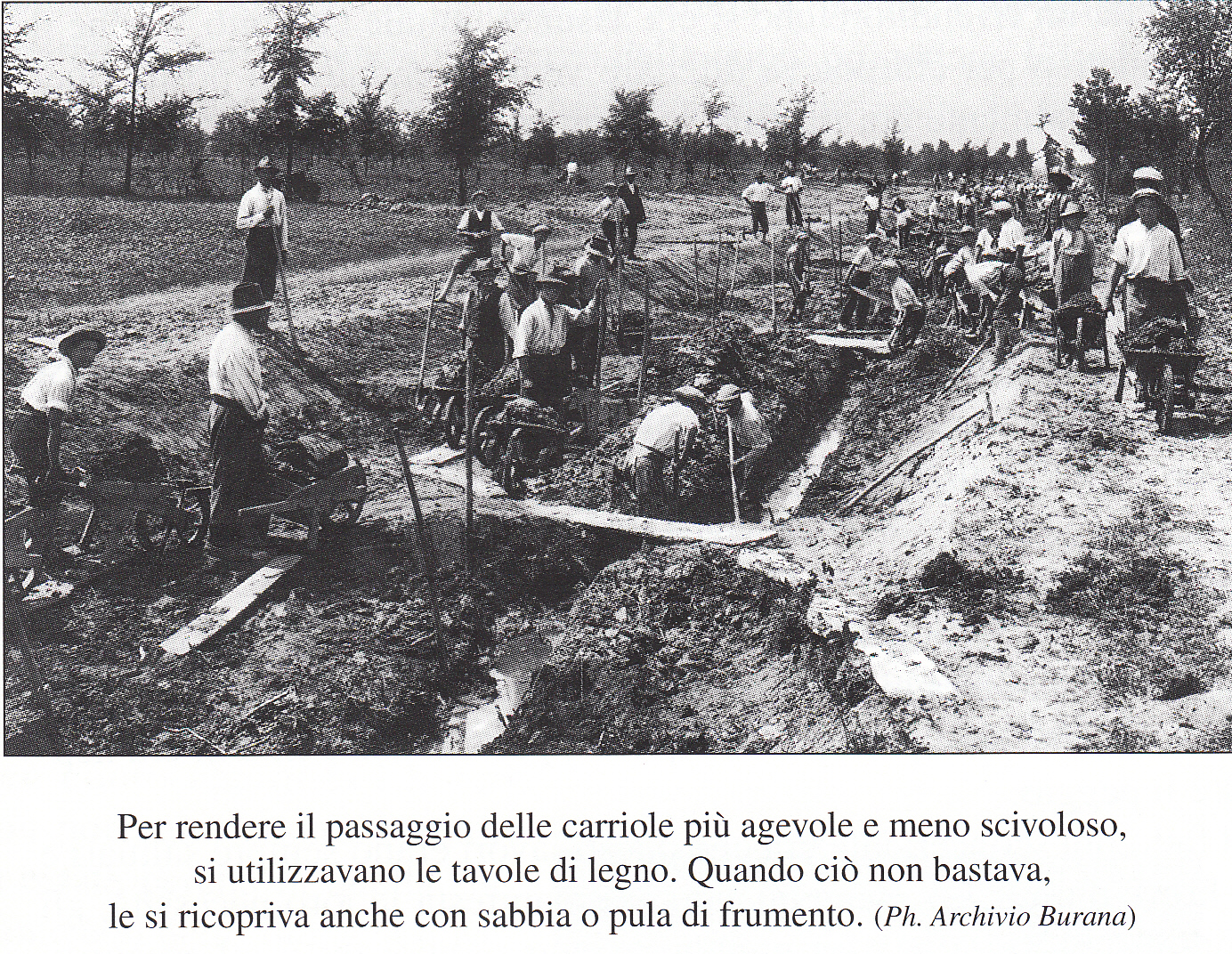 “Fra i lavori più impegnativi di carriola a cui ho partecipato va ricordato un ributto d’argine del Panaro. Era un lavoro per uomini efficienti, e questo non tanto per la fatica richiesta nello spingere in alto la carriola, quanto per le scorribande che vi erano da fare su e giù per l’argine. A questo scopo basterà tenere presente che la discesa ripida da farsi all’esterno con la carriola carica richiedeva già di per sé gambe solide, e non meno quando si invertiva marcia risalendo, tirandosi dietro la carriola. Arrivati poi alla sommità dell’argine per guadagnar tempo si piombava giù verso il basso verticalmente senza alcun ritegno. Era quella una ginnastica certo non adatta ai vecchi . Per evitare le ore più calde, il lavoro cominciava alle cinque del mattino. Alle sette e trenta si faceva colazione.