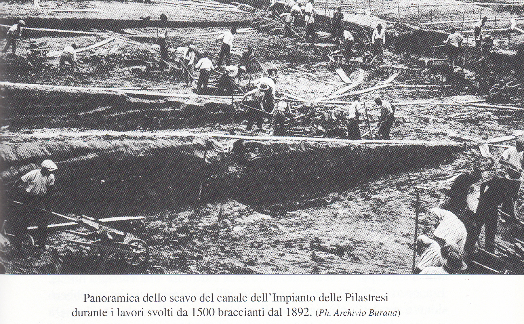 “I lavori durarono un paio d’anni e vennero suddivisi in tanti lotti; per ogni tronco nel quale ci si metteva mano, l’acqua che non si riusciva ad estrarre veniva travasata nella stessa cava; non di meno ci restava fango ed acquitrino da rendere il lavoro molto disagevole. Per sostenere le carriole era di necessità usare un gran quantitativo di tavole di legno; con le stesse tavole venivano improntate anche le rampe, ciò nonostante quell’espurgo mal si tratteneva sulla carriola cadendo così sulle stesse tavole e nello stesso tempo mettendo in difficoltà chi doveva camminarvi sopra. Per surrogare a quell’imbrattamento ed evitare così un maggiore scivolamento si ricorreva ai ripari spargendovi sopra sabbia o pula di frumento, ma anche quello era un rimedio di scarsa efficacia, in quanto con le scarpe infangate dette scorie venivano asportate.