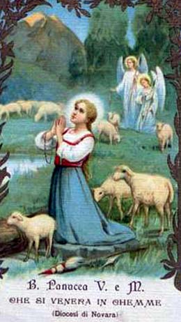 Panacea nasce a Quarona (cittadina tra Borgosesia e Varallo) nel 1368 ed è presto orfana di mamma. Papà si risposa con una certa Margherita, anch’essa vedova e con una figlia, e per la piccola cominciano i guai. Matrigna e sorellastra si coalizzano infatti contro di lei, riservandole i lavori più pesanti e umili, deridendola per la sua pietà, contestando i suoi gesti di carità. Le biografie, infatti, concordano nel descrivere Panacea come una fanciulla che prega molto, si prende cura dei malati e soccorre i poveri: una cristiana autentica,dunque, che per di più sopporta con eroica pazienza le cattiverie con cui ogni giorno è bersagliata in casa. Panacea, dunque è molto di più della scialba “Cenerentola”, vittima di una gelosia familiare o di una semplice antipatia. Contro questa ragazzina che vive con semplicità, ma anche con intensità, la sua fede è in atto una vera e propria persecuzione “casalinga”, che raggiunge il suo culmine in una sera della primavera 1383. Panacea, che ha 15 anni e quindi non è più una bambina, non torna quella sera dal pascolo con la puntualità che la matrigna pretende. Con la rabbia in cuore e il risentimento di sempre quest’ultima va a cercarla e la trova nei pascoli che sovrastano Quarona. e la sua ira si scatena constatando che Panacea sta ancora pregando. L’ira, si sa, è sempre cattiva consigliera, e la donna passa facilmente dalle parole ai fatti, colpendo ripetutamente la ragazza con un oggetto contundente, forse un fuso o un bastone trovato sul posto, fino ad ucciderla. Forse è davvero un omicidio preterintenzionale, perché nessuno è autorizzato a pensare che l’astio della matrigna potesse in realtà nascondere il desiderio di ucciderla. Lo dimostra anche il fatto che la matrigna, in preda alla disperazione per quanto compiuto, va subito a suicidarsi, gettandosi in un vicino burrone. Per Panacea, invece, scoppia la devozione popolare, perché la gente vede nella sua morte un autentico martirio. La salma viene portata a Ghemme, per essere sepolta accanto alla sua mamma che l’aveva lasciata orfana troppo presto.