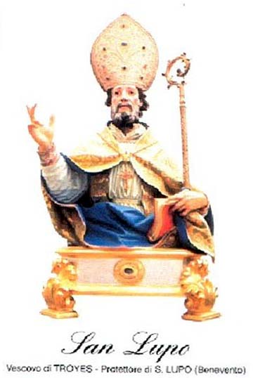 Nato a Toul, in Alsazia, intorno al 383, Lupo si fece monaco nell’abbazia di Lèrins dopo aver distribuito ai poveri tutti i suoi beni. Eletto vescovo di Troyes nel 426, difese la città dalla furia devastatrice degli Unni e combatté strenuamente il dilagante clima eretico. Il martirologio romano nel ricordo romano ne ricorda la «deposizione» il 29 luglio, giorno in cui la Chiesa beneventana ne ha sempre celebrato la memoria. Il culto di san Lupo, in Benevento e nella sua diocesi, risale almeno al IX-X secolo.