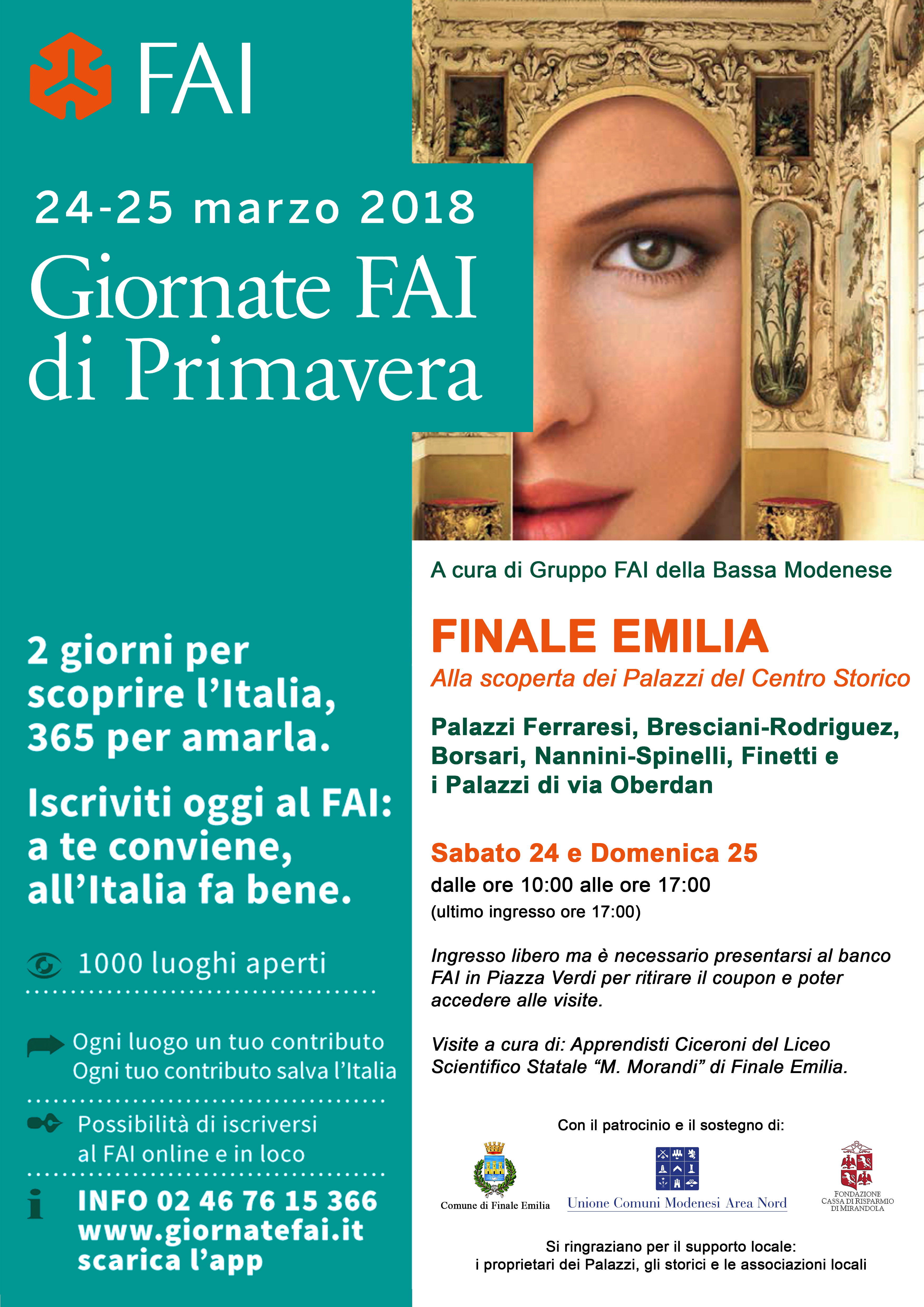 Il Gruppo FAI Bassa Modenese, costituito da arch. Marina Speziali(Capogruppo), arch. Isabella Bastiglia e Marco Rebecchi per le Giornate Fai di Primavera, propone un percorso itinerante nel centro storico, danneggiato dal sisma del maggio 2012, dove sarà possibile visitare i palazzi di Via Oberdan, Ferraresi, Bresciani-Rodriguez, Borsari, Nannini – Spinelli, Finetti, che testimoniano il particolare ruolo geografico ed economico che ha sempre svolto la città di Finale Emilia.
