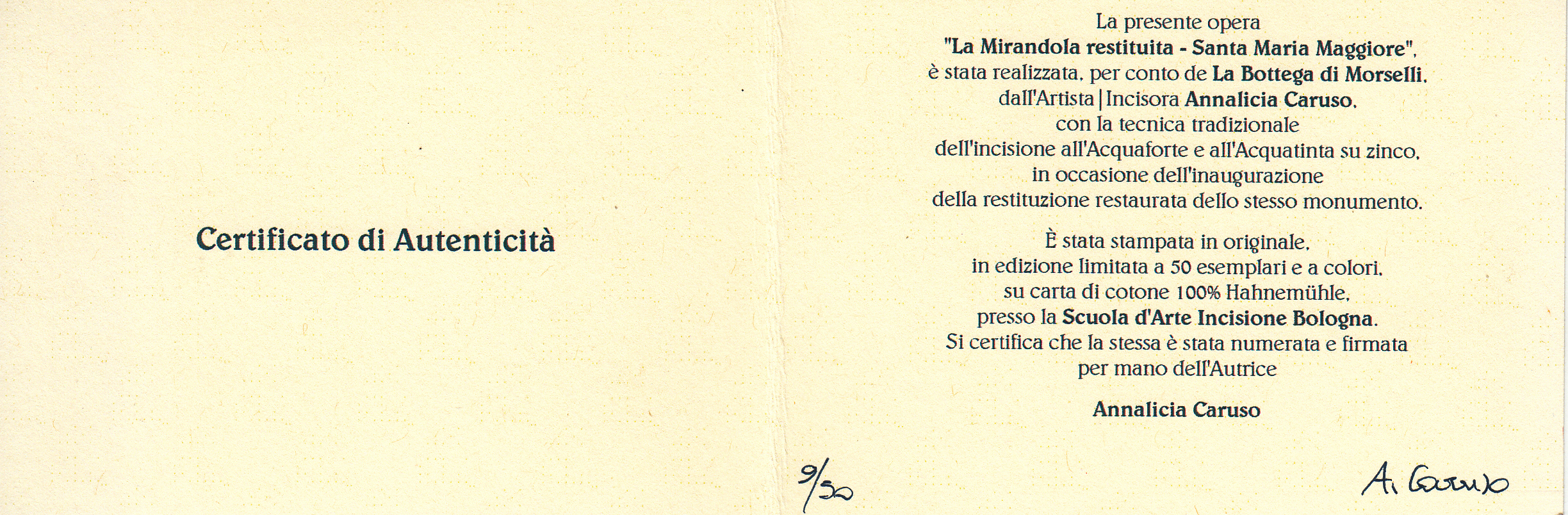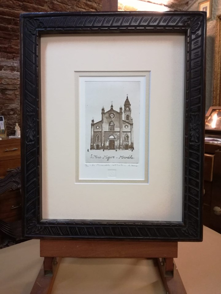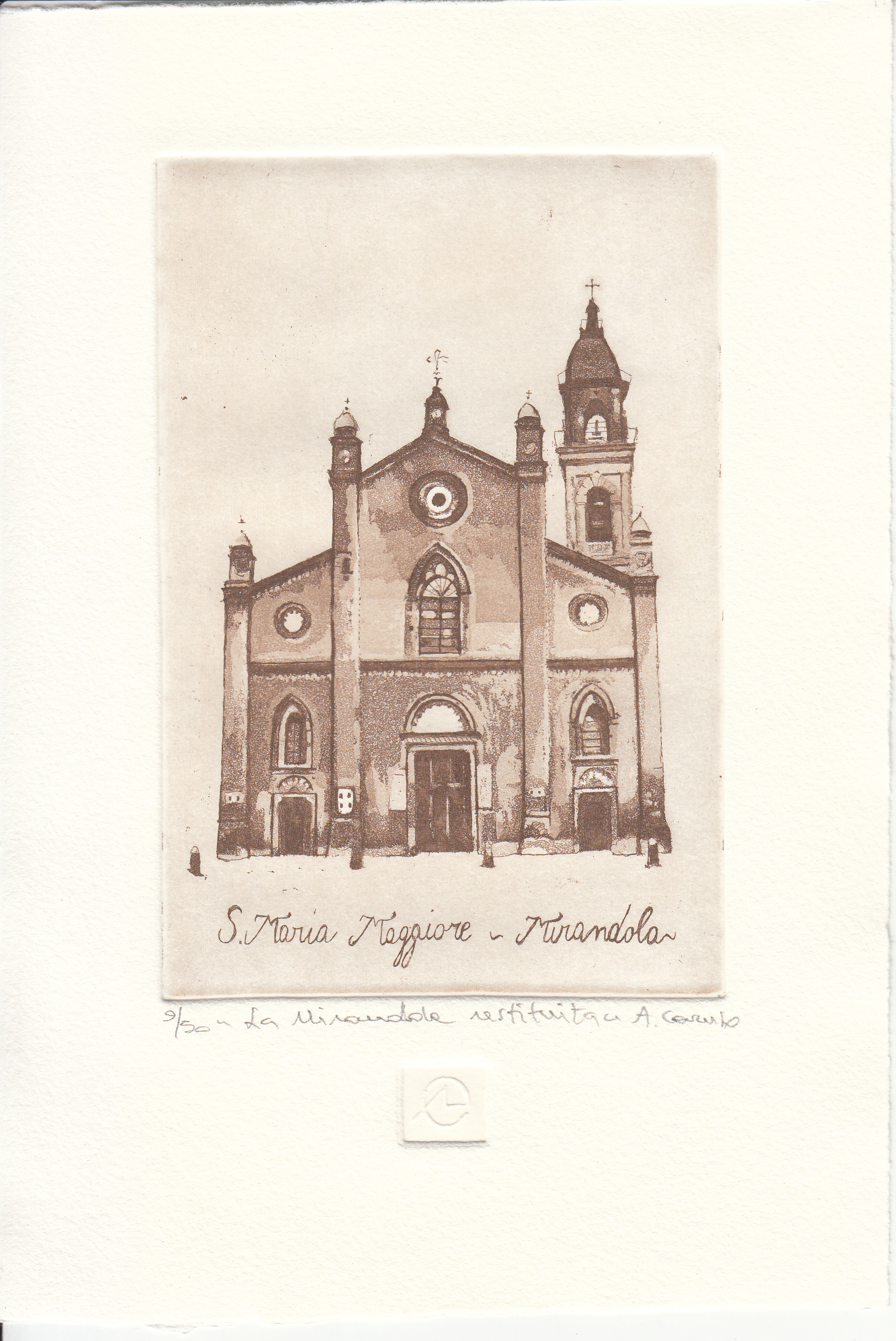 Nel mese di settembre verrà restituita alla nostra comunità il Duomo …Santa Maria Maggiore…chiesa tanto amata dai mirandolesi. Sarà il primo edificio pubblico terminato ed è tanta la gioia del nostro illustre artigiano Giorgio Morselli che ha pensato di far realizzare una incisione da una pregevole artista bolognese , Annalicia Caruso . Misura della immagine reale mm 100 x 150.