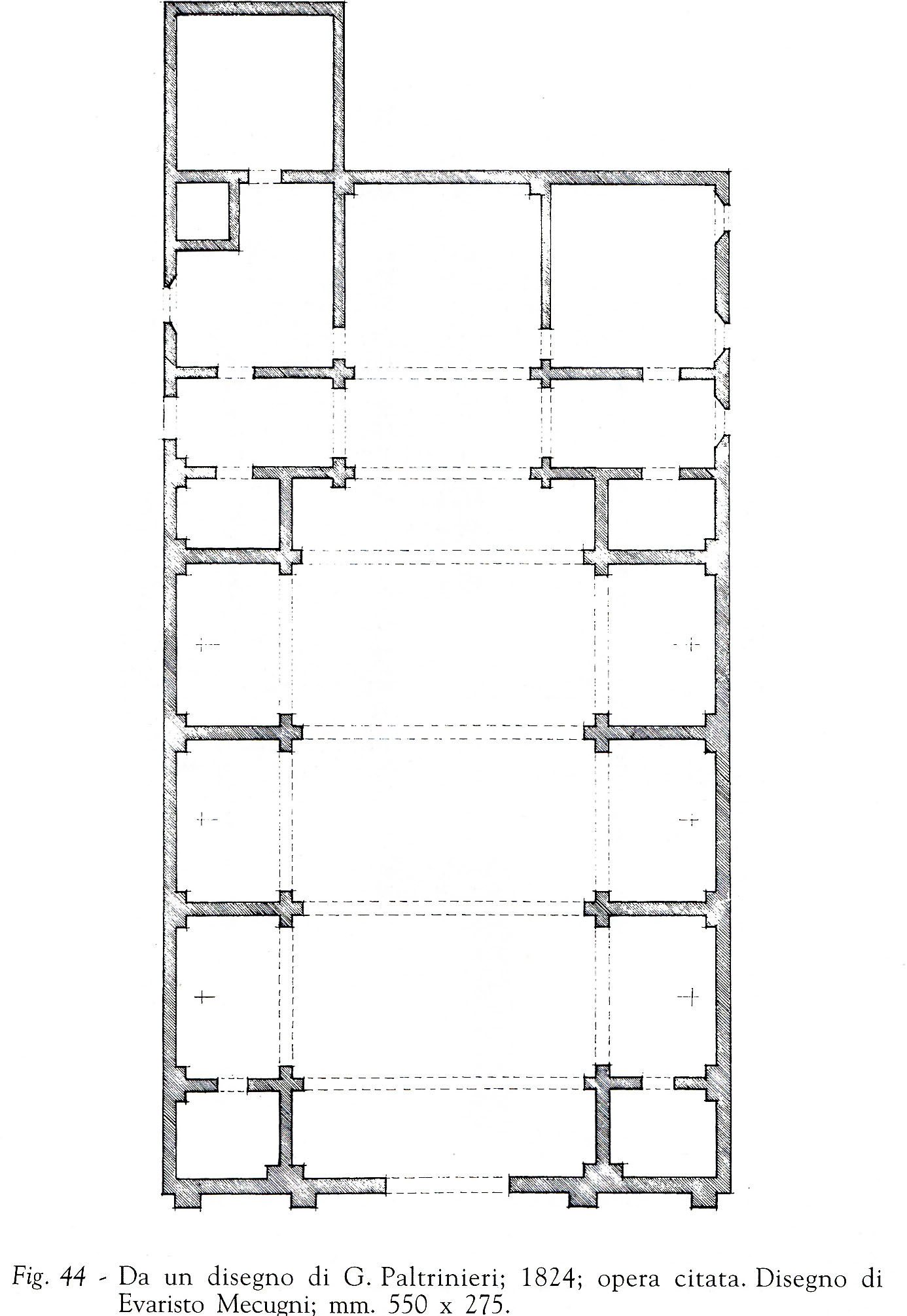 Misure principali: larghezza, m. 17,55; lunghezza, m. 38,74; altezza fino al cornicione, m. 14,40.