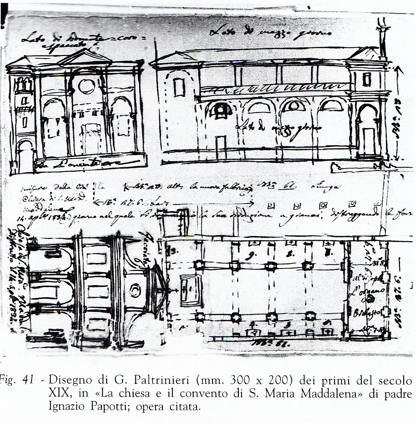 La Chiesa si S. Maria Maddalena dei Canonici Regolari di S. Salvatore, prospetti, pianta e misure.