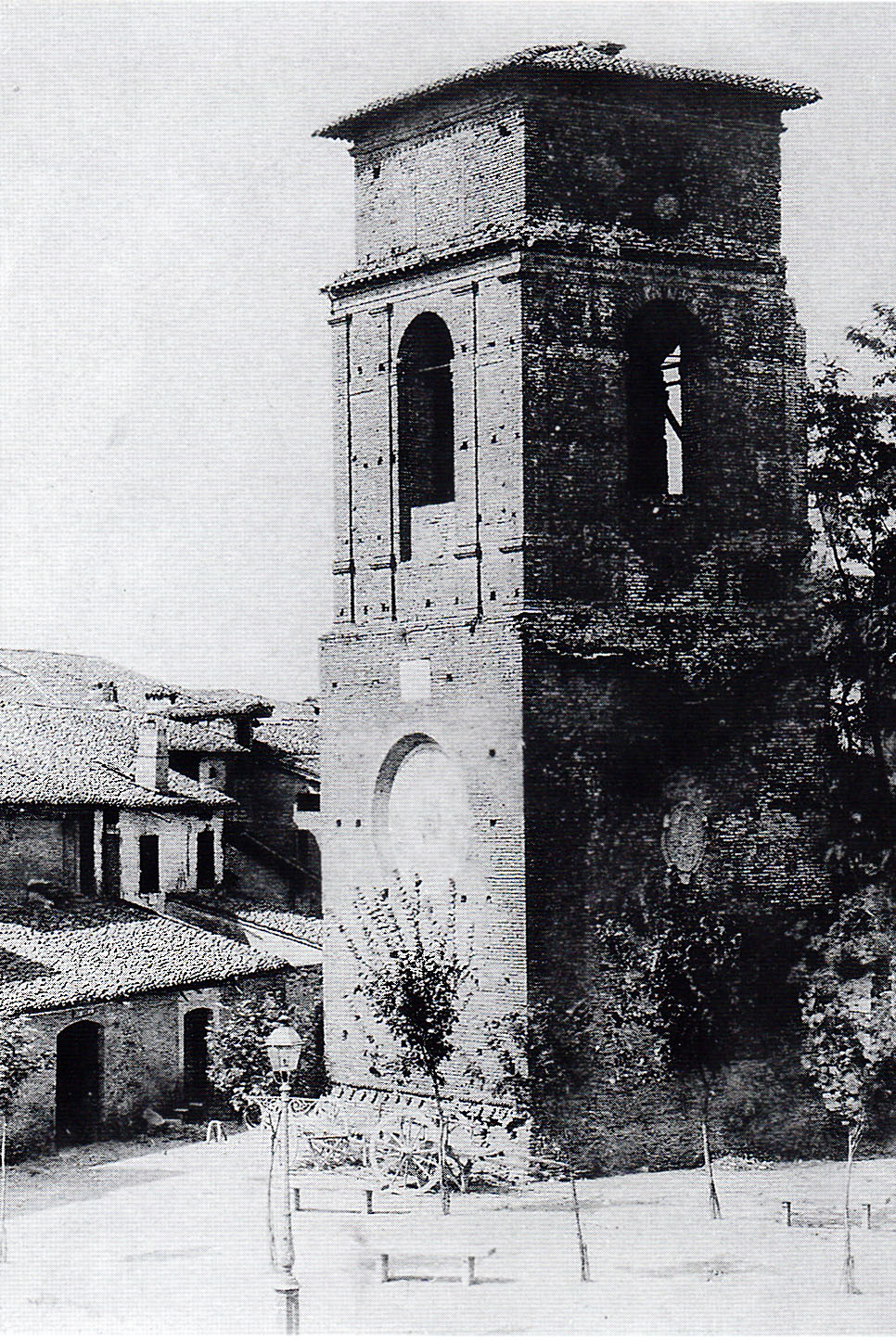 Il campanile era a sinistra della chiesa e la sua parte superiore che era stata colpita dall’artiglieria francese nell’anno 1707 ed era crollata, era abbellita in origine da una serie di piccole bifore di cui rimase a lungo quella inferiore.