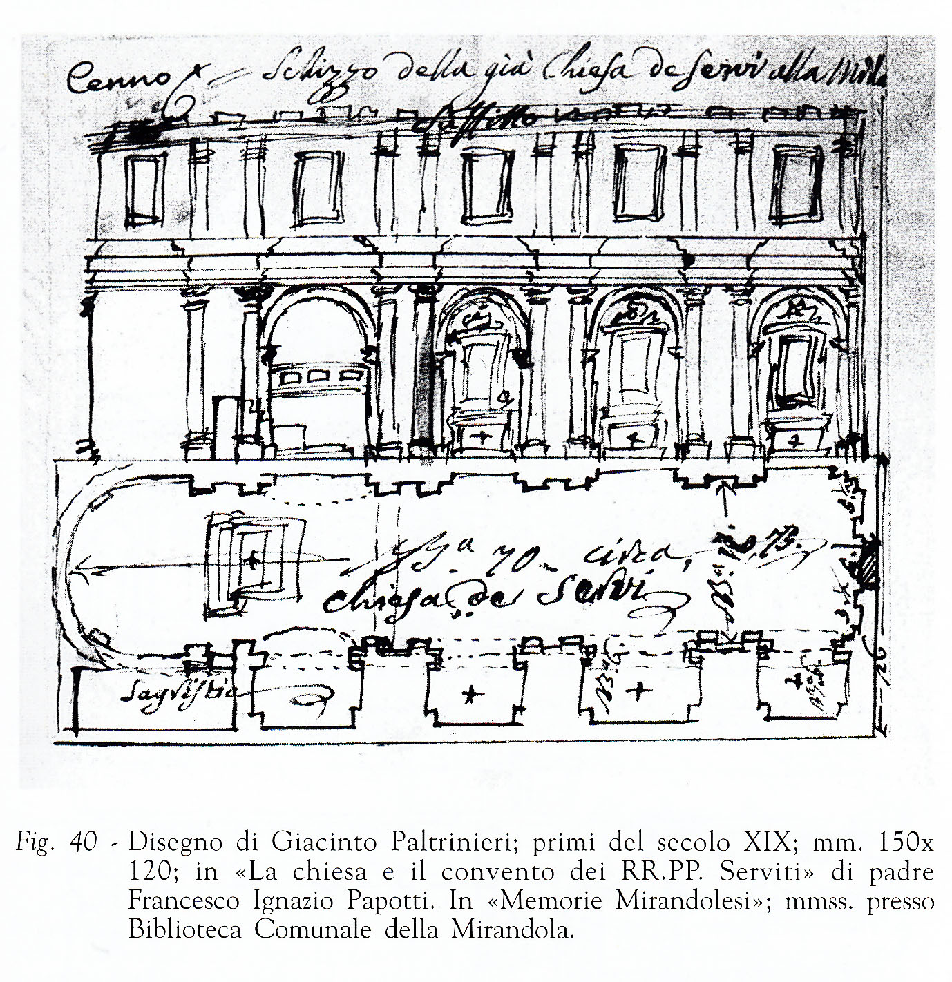 Pianta, spaccato e misure della Chiesa dei Servi