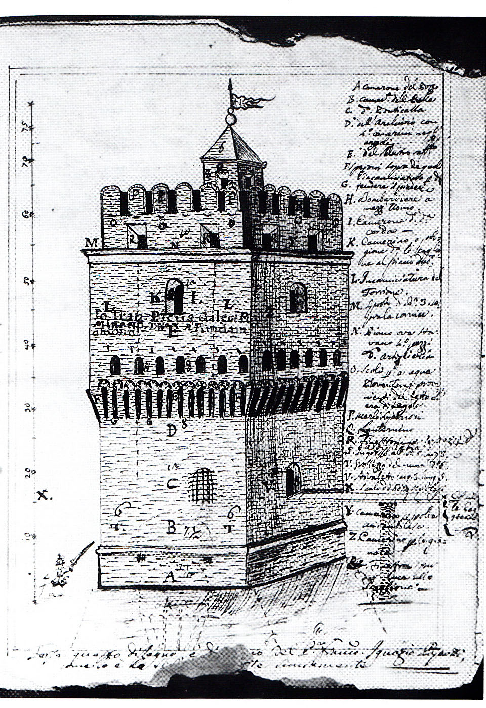 L’edificio si trovava nel mezzo del cortile della Rocchetta, completamente isolato; non aveva porta al piano terreno. Una porticina si apriva all’altezza del terzo camerone cioè del terzo piano e si metteva in comunicazione mediante uno stretto ponte levatoio con una stanza fortificata di un fabbricato vicino; quando il ponte era alzato la torre rimaneva isolata ed inaccessibile.