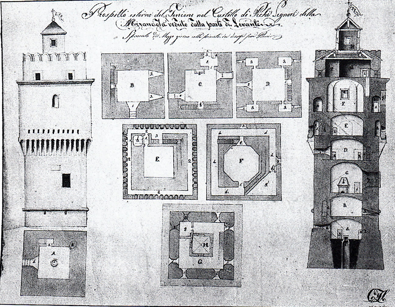 Il tipo della costruzione, con i suoi sei grandi cameroni a volti, sovrapposti, isolabili uno dall’altro, le scale ricavate nello spessore delle pareti, le rade finestre, le più basse protette da sbarre snodabili dall’interno, era anche per quei tempi estremamente nuovo ed interessante.