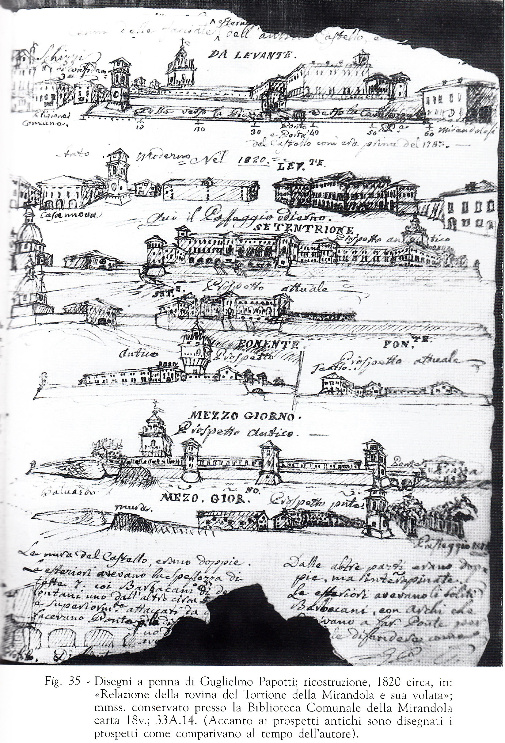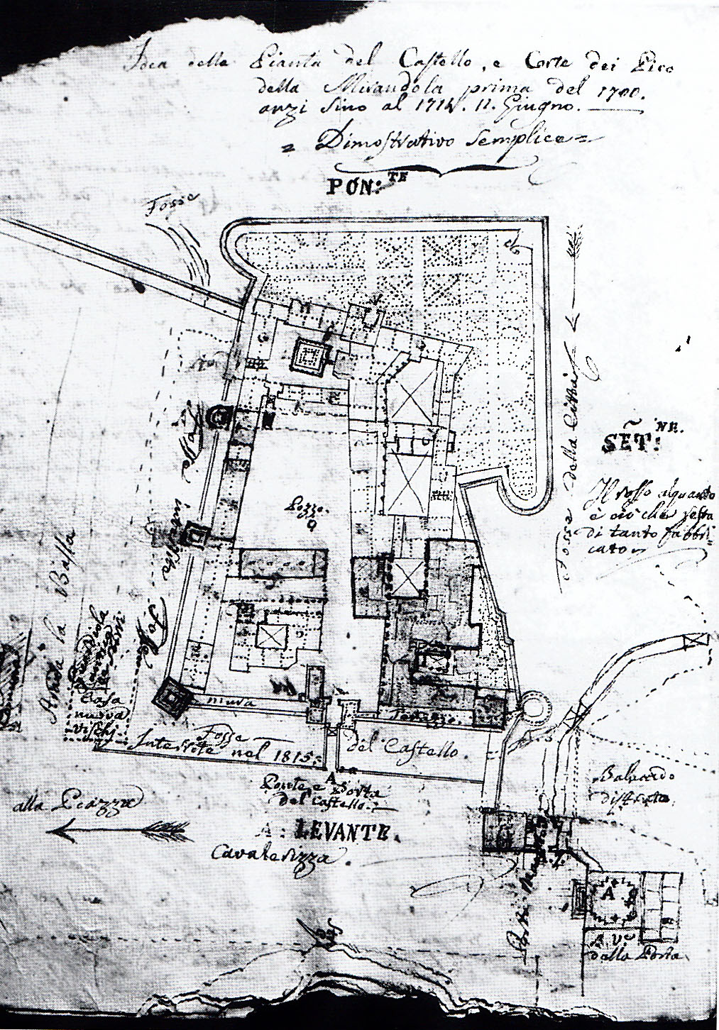 Sfortunatamente, a causa della distruzione dell’Archivio Pico, nulla di preciso si sa del nome degli architetti; la lacuna che è di carattere generale per le costruzioni di tutta la città, è tanto più spiacevole in quanto qui comparivano, in diverse parti, i riflessi di artisti notevoli (Galleria Nova, ecc.) e l’intervento di valenti architetti militari (Torre Grande, ecc.). Nonostante diverse descrizioni e le vedute parziali di alcune stampe antiche sarebbe stato impossibile ai nostri giorni avere una idea chiara e precisa dell’aspetto sia dei singoli fabbricati che dell’insieme se non si fossero trovati dei disegni, del primo ottocento, che sulla scorta di altri anteriori e in base a documenti riproducono i prospetti di tutti e quattro i lati del castello come si presentavano al secolo XVII colla pianta degli edifici e la loro planimetria.