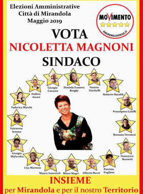Ho appoggiato la politica del M5S candidandomi nella lista elettorale del Movimento capitanata dall’aspirante Sindaco Dott.ssa Nicoletta Magnoni per le elezioni amministrative nel Comune di Mirandola del 26 maggio 2019, perché condivido i valori espressi dai 5 stelle: tutela dell’ambiente, dell’aria, dell’acqua, dello sviluppo fatto di energie rinnovabili e connettività o viabilità sostenibile, che in poche parole significa vivere in un ambiente salutare, e penso che Mirandola, dovrebbe essere la “città dello sport”, senza diversità e frontiere, che vorrebbe dire: la città della salute, siccome i valori dello sport sono i valori della vita: amicizia, lealtà, onestà competizione, cultura, tempo libero, scienza e vita sana sia fisica che psicologica e sociale.