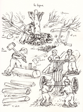 Si faceva una cernita dei tronchi abbattuti: quelli sani e lunghi si mettevano da parte per farne assi, quelli mal formati o cavi venivano spaccati. Per spaccarli si adoperavano i cùnei, li biéti e con la masa ad legn,a sach piciava in testa: pian piano i cunei penetravano nel tronco che crepava in profondità per poi aprirsi su tutta la lunghezza in due parti: si ricavavano li stèli. Queste venivano messe sulla cavaléta per essere tagliate a giusta misura per essere bruciate nella stufa.