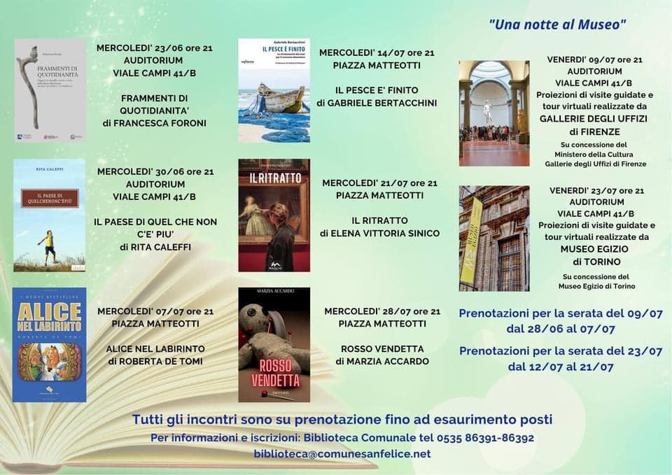 L’incontro con Marzia Accardo chiude la rassegna “Luglio live 2021”, organizzata da assessorato alla Cultura del Comune e Pro Loco, che dal 1° al 28 luglio ha visto alternarsi in auditorium, nelle piazze Matteotti e del Mercato, concerti, presentazioni di libri, conferenze e interviste sui viaggi, visite virtuali ai musei, una serata alla riscoperta del dialetto locale. Gli appuntamenti, che hanno rigorosamente rispettato le disposizioni anti Covid, hanno richiamato tanti sanfeliciani con la voglia di uscire e riappropriarsi degli spazi cittadini dopo i lunghi mesi di pandemia.